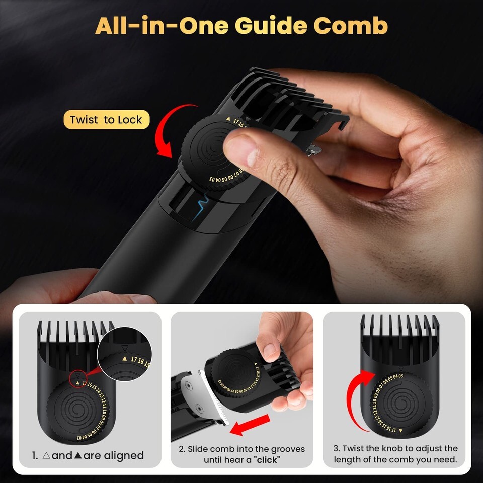 Body Shavers for Men Head with an Innovative Guide Comb: This mens hair trimmer head comes with an all-in-one guide comb, convenient to deal with different hair lengths by simply twisting the length you need (scale of the guide comb from 3mm to 17mm).