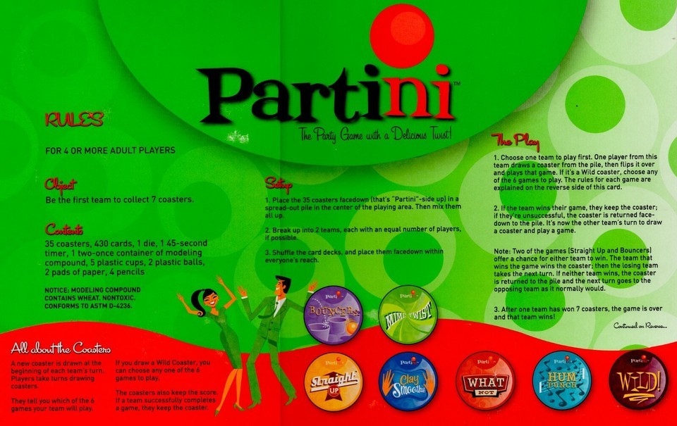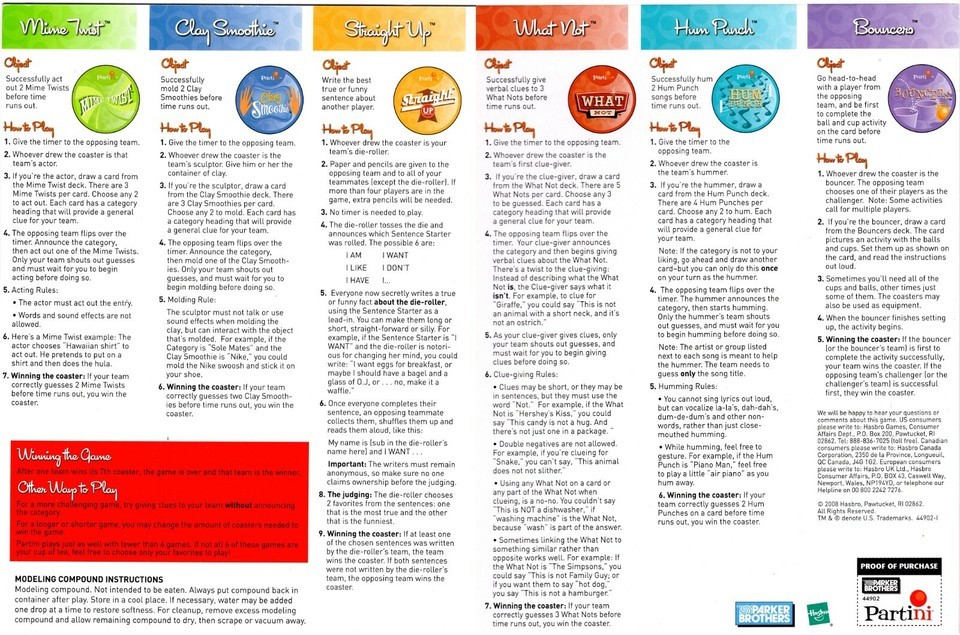Hasbro has gone to great lengths to make this Partini as attractive as it is fun to play. It comes in a large, sturdy, suitcase-like box. Well-made and attractively-illustrated; cups and balls, pencils and paper, and a special Straight-Up die.