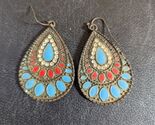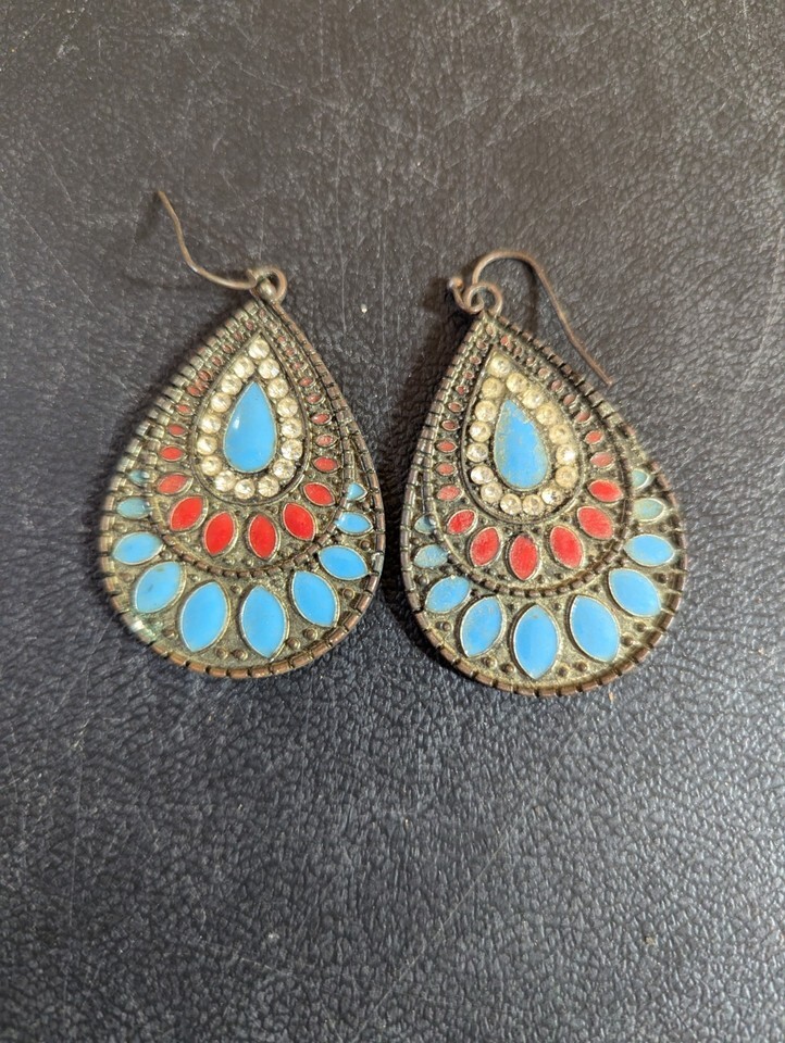 These Bohemian Teardrop Bronze Fashion Earrings feature a teardrop shape with a multicolor design, including a blue main stone. The earrings are 1.5" in length and have a hook closure. The beaded and dangle/drop style adds a touch of bohemian flair to any outfit. Made of bronze, these earrings are a stylish accessory for those who appreciate unique and trendy jewelry pieces.