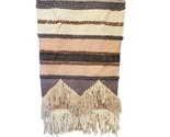 Beautiful boho-style woven wall rug/tapestry in soft earthy tones of brown and light pink. Features a sharp M-shaped pattern with cozy tufted texture, giving it a wool-like appearance. Designed with fringes at the bottom for an authentic bohemian finish. Measures 29? wide x 50? long, making it a statement wall decor piece for living rooms, bedrooms, or creative spaces.