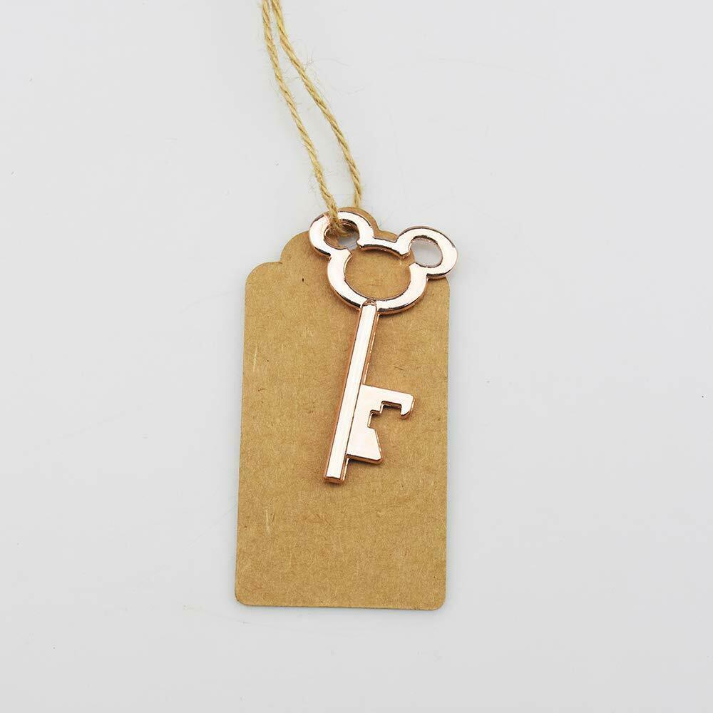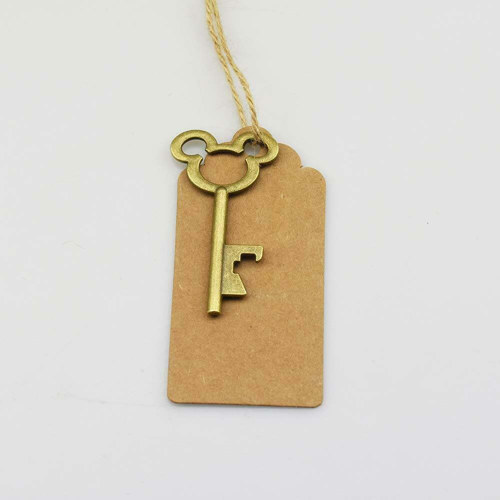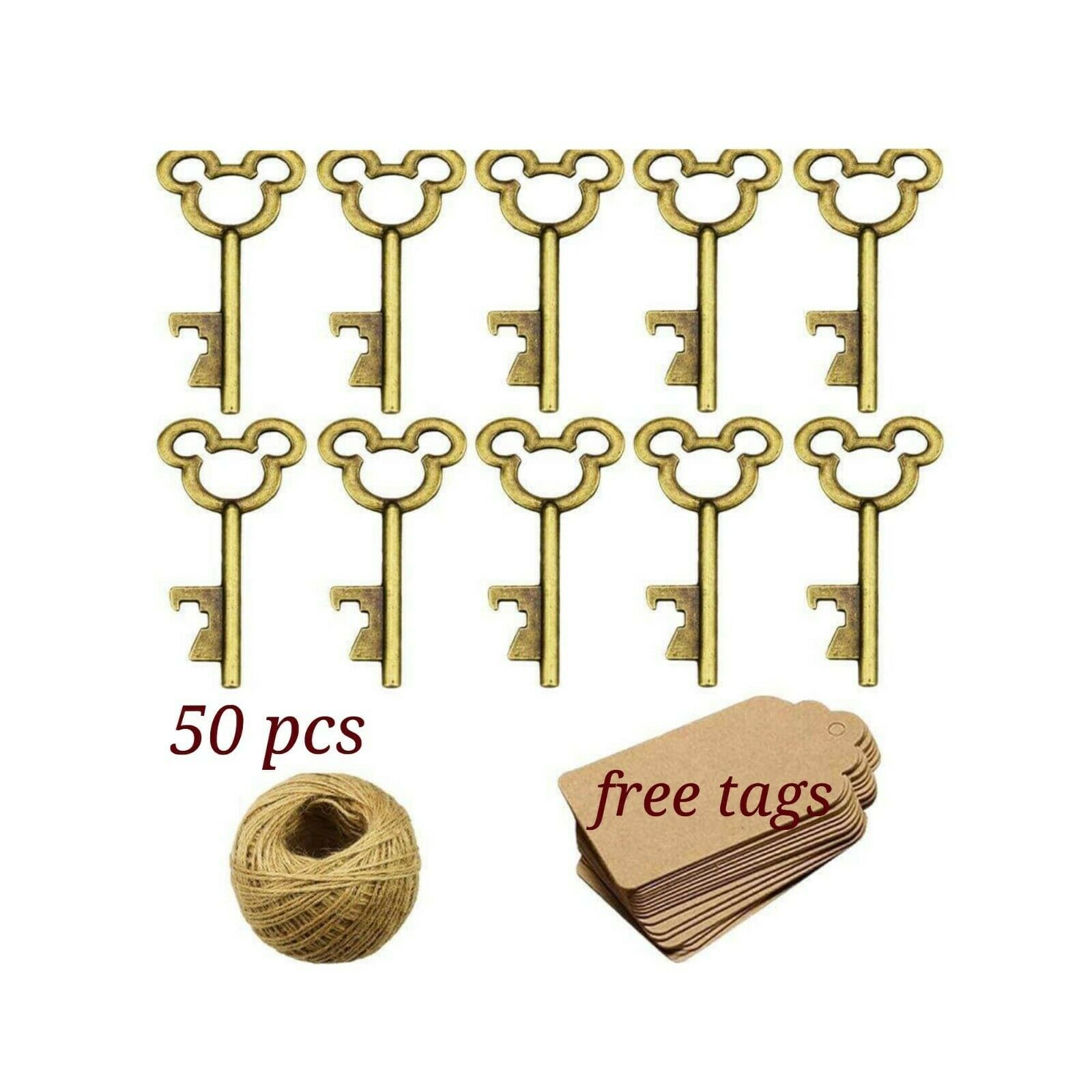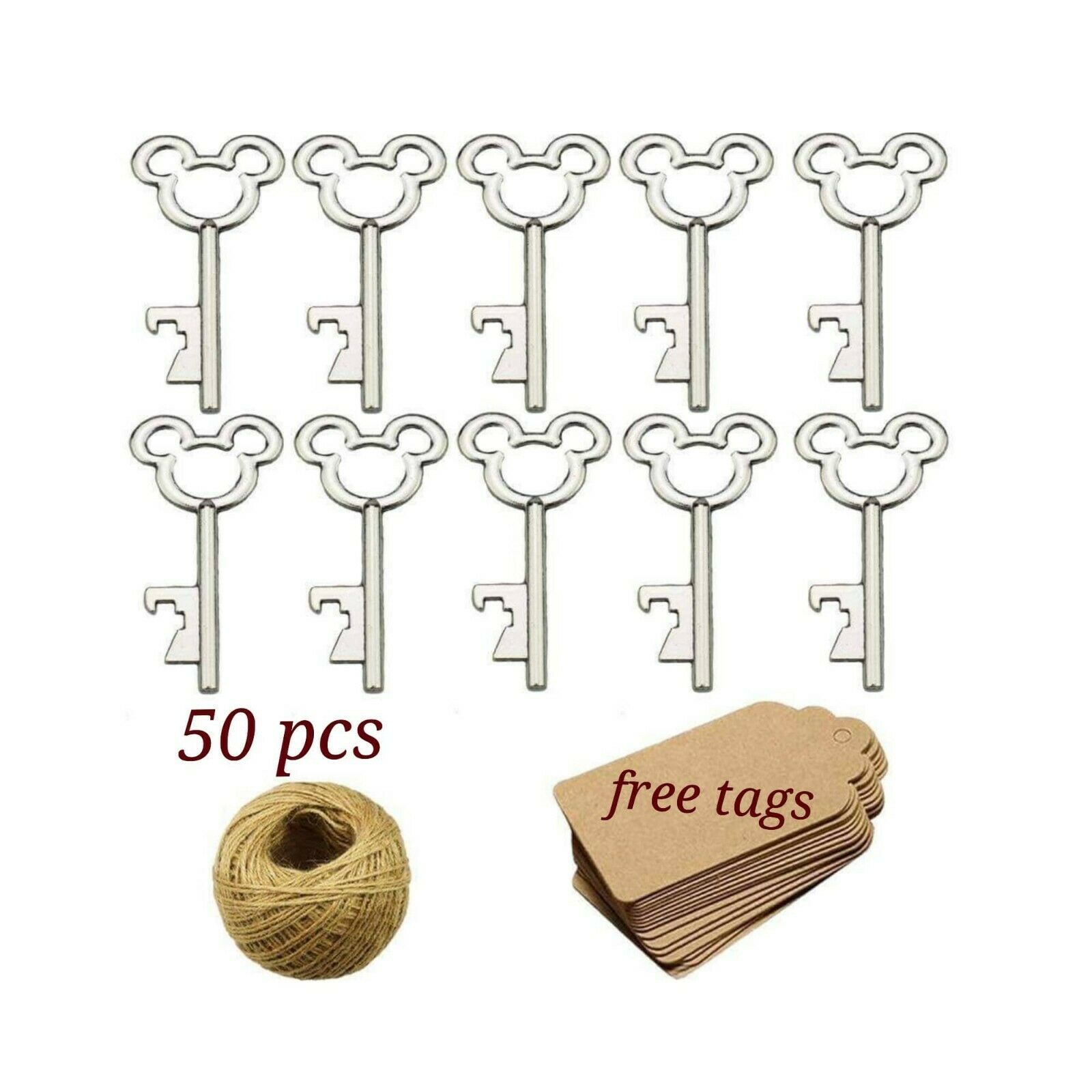 This listing is for a set of 50 mickey mouse bottle openers, 50 kraft tags (blank) and 25 meters twine.