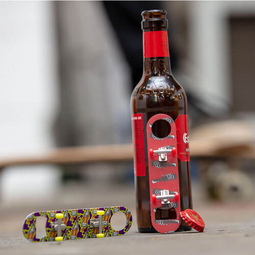 KICK FLIP THEN KICK BACK - Skateboarding is thirsty work! This fun 'Bones' Beerflip fingerboard skateboard-shaped bottle opener is complete with functional wheels and an cool graphic design!