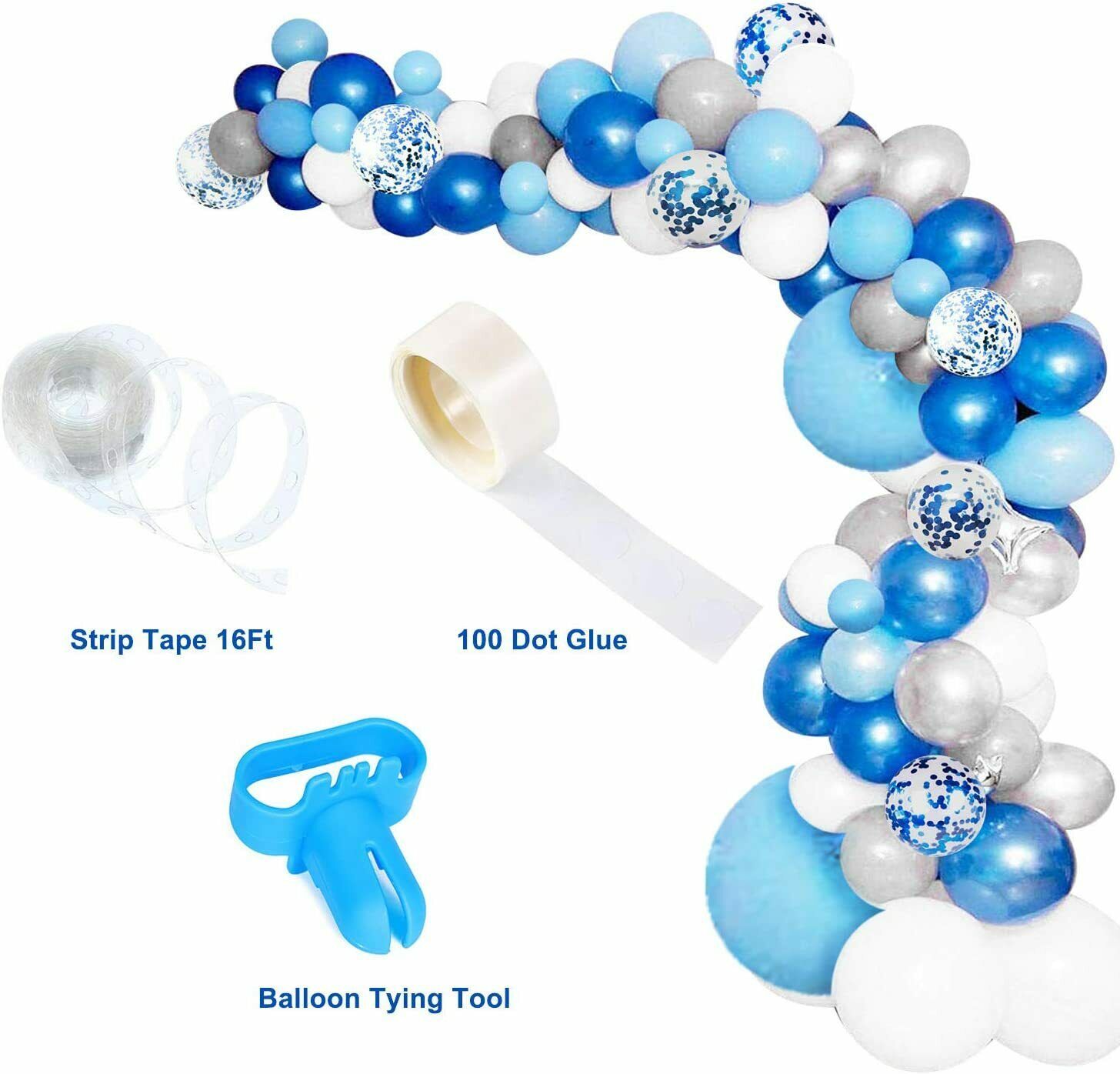 Blue, white, silver and confetti balloons package kit super easy to make BALLOON GARLAND or ARCH looks gorgeous. Assembled easily, the air will stay in balloons for along time at least 7 days. Please follow the specification to make garland or arch inside the packages.