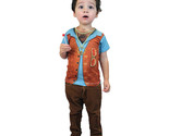 Give your child an interesting look with this T-shirt with vest, collared shirt, peace sign and ample chest hair printed realistically on the shirt itself. 100% polyester.