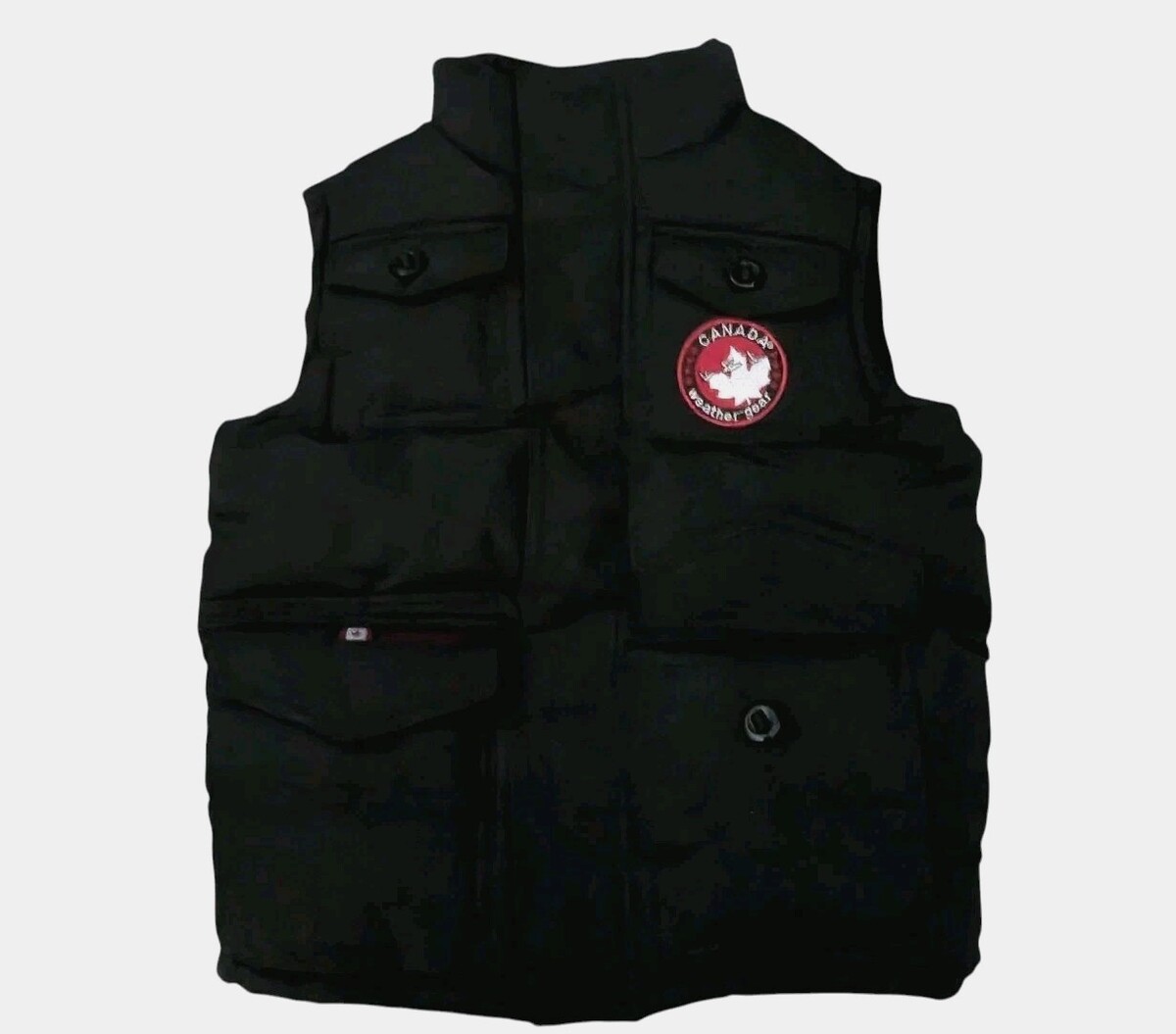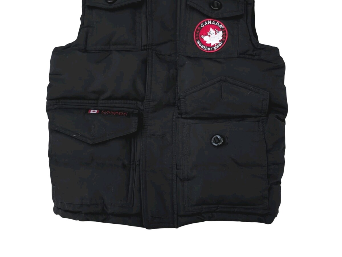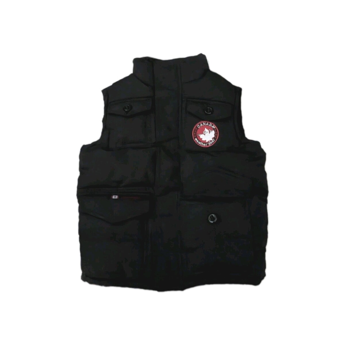 This is a boys Canada Weather Gear super heavyweight winter vest. Size 7. Black with pockets at the front and chest. This vest looks like new.