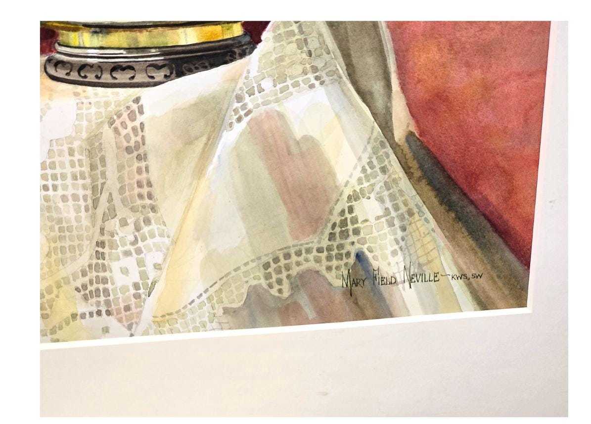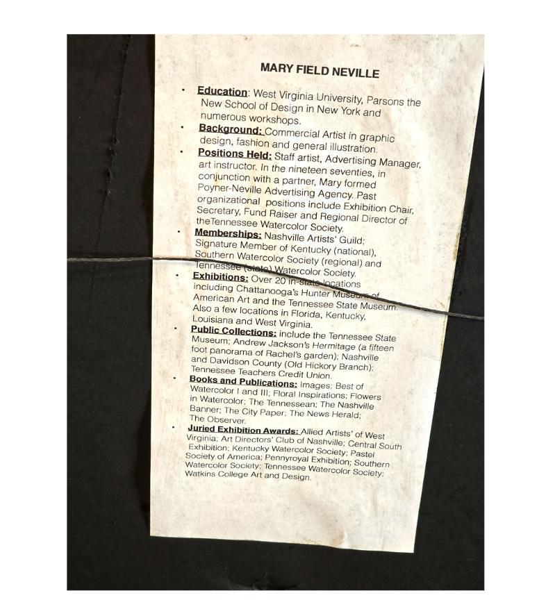 M. Neville (1932-2024), a popular artist, native of W. Virginia, was educated at W. Virginia University and School of Design. She worked as a commercial artist in New York City graphic design, fashion and general illustration; she has held positions as advertising manager and art instructor giving workshops and teaching privately throughout the South. Based in Nashville middle Tennessee, her paintings of mostly watercolors, sketches and oil on canvas are included in private and public collections including the Tennessee State Museum and historic venues such as Andrew Jackson’s Hermitage. M. Neville held many prominent arts positions: Board member of the Madison Art Center, Tennessee Watercolor Society (Regional Director, Secretary, and Exhibition Chair), a member of the Nashville Artist Guild and a signature member of the Kentucky, Southern, and Tennessee Watercolor Societies.