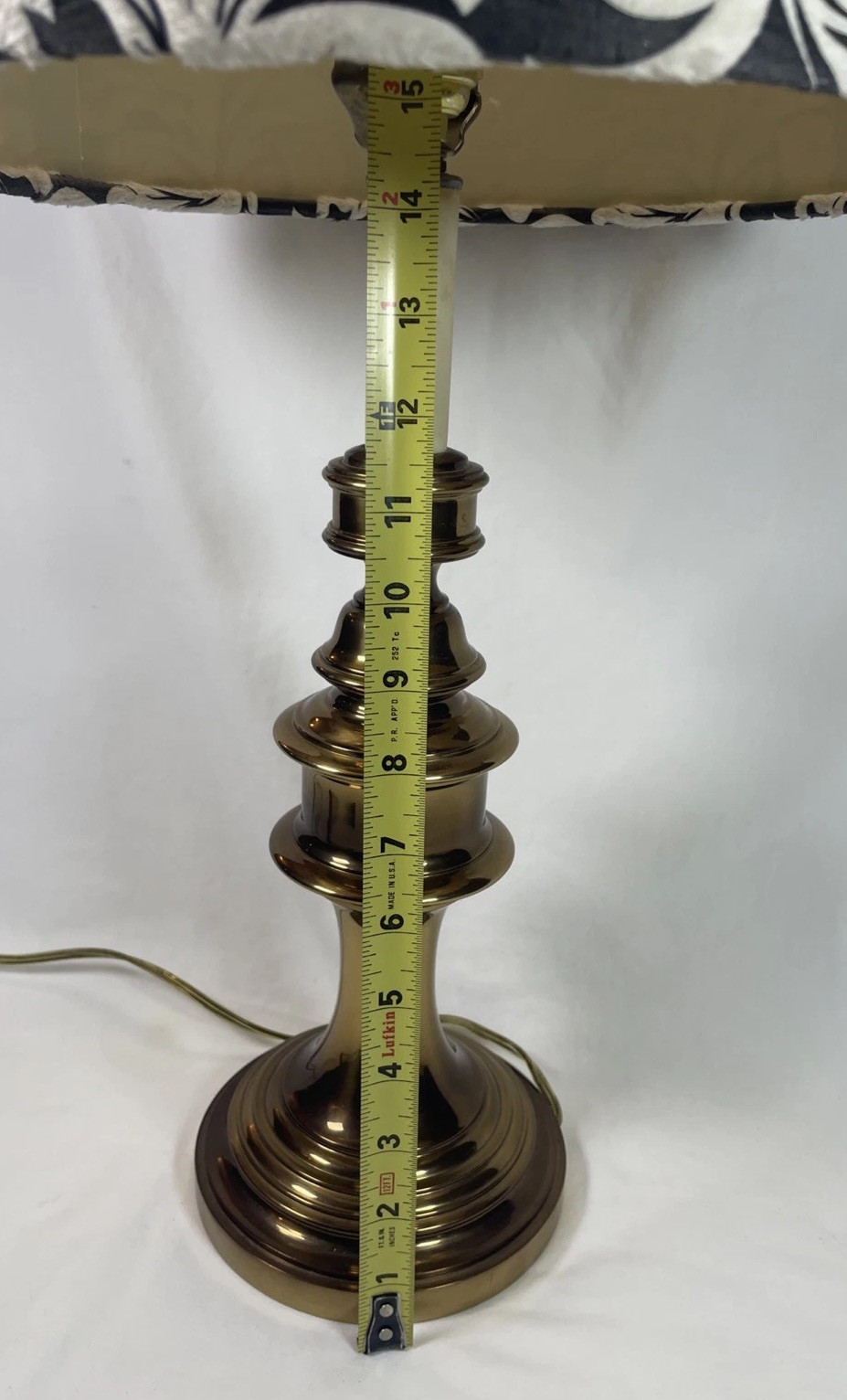 This pre-owned brass lamp has a heavy 5.25 lbs base and is in very good condition with one dent in the bottom base of lamp (see photos) and a few dents in lamp shade (easy to see on the inside of the shade but is hard to see on the outside).