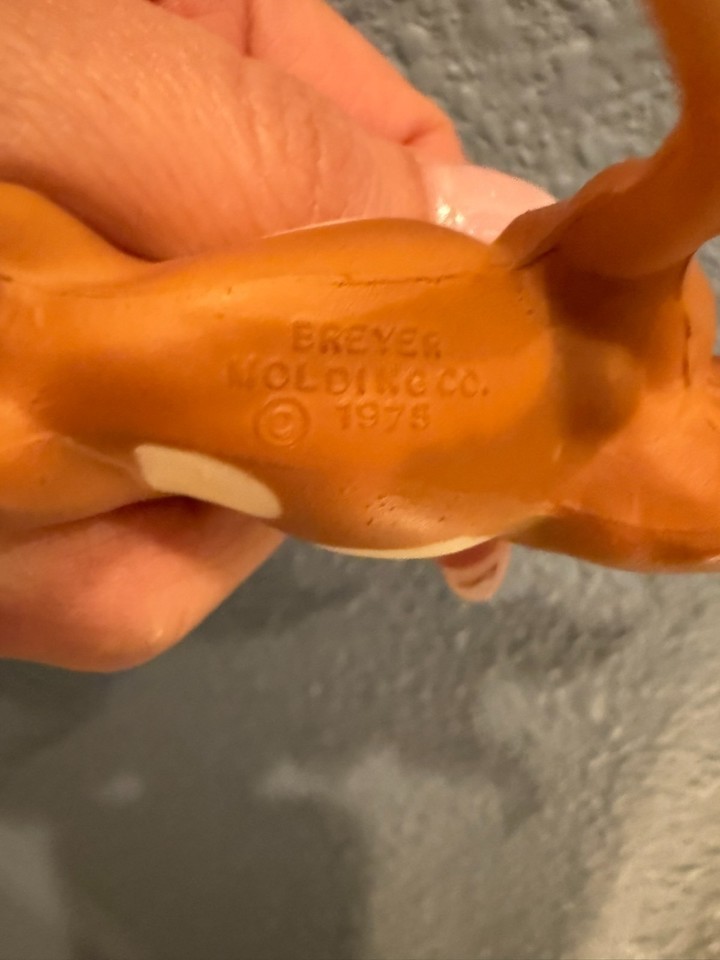 This charming Breyer Stablemates horse features the classic cantering Thoroughbred mold in a bold chestnut pinto (overo) pattern. Though stamped ? Breyer Molding Co. 1975,? this particular colorway was part of later releases in the 1990s?2000s, often included in play sets or collector packs.