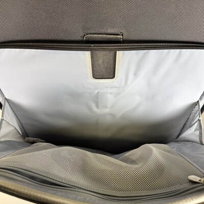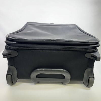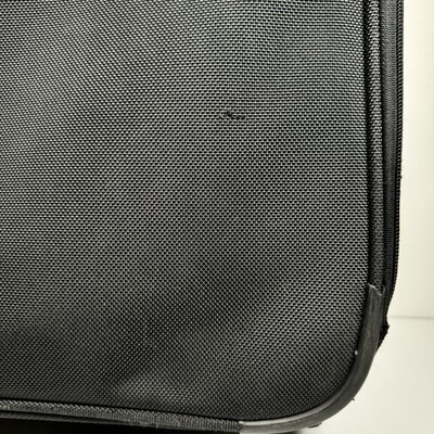 There's two defects that need attention. The front outside pocket zipper stitches on the upper right corner are loose as shown. Also the plastic cross member between the extendable handle is cracked as shown. The rest of the bag shows wear and tear but is in good used condition as shown in the photos. It measures approximately 26" tall x 18" wide x 10" deep and weighs 12 lbs 7 ounces. See pictures for more details.
