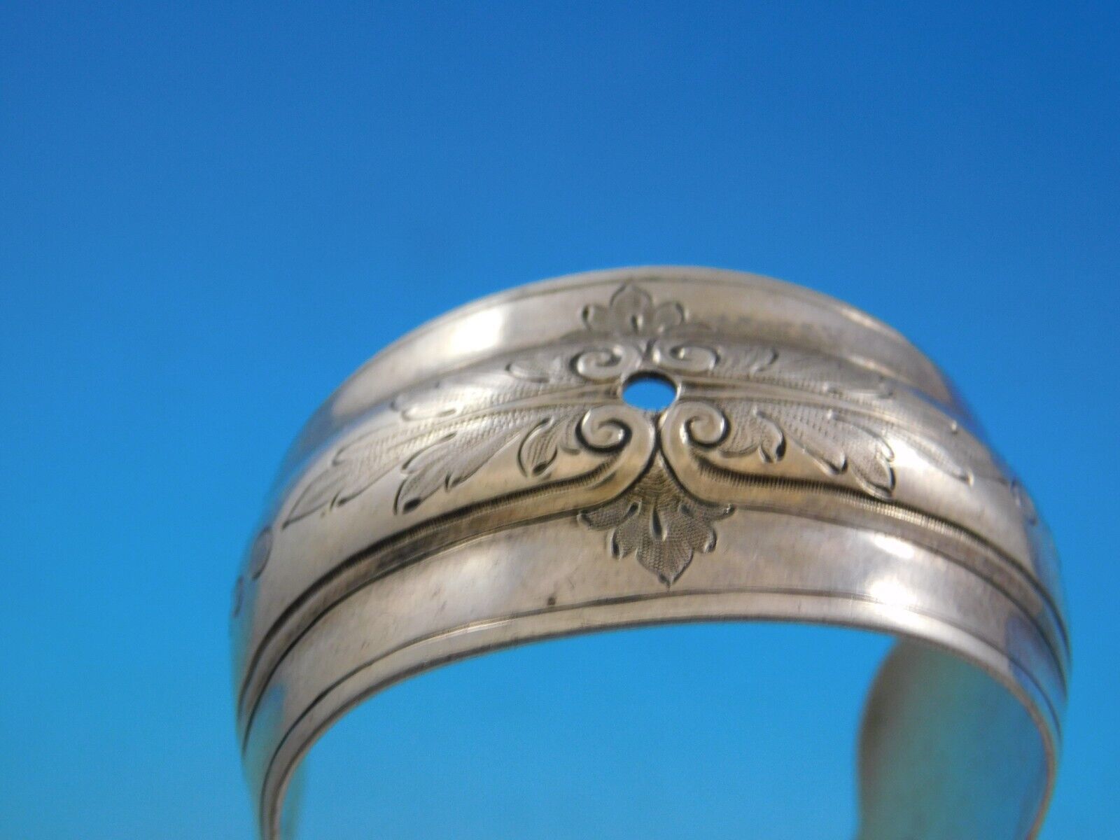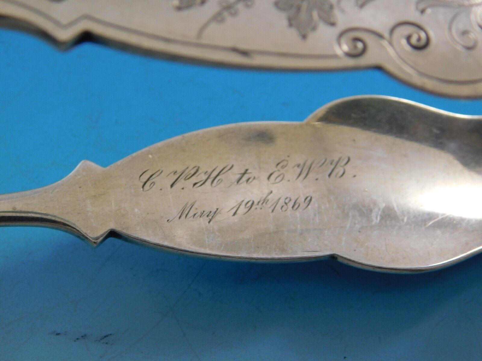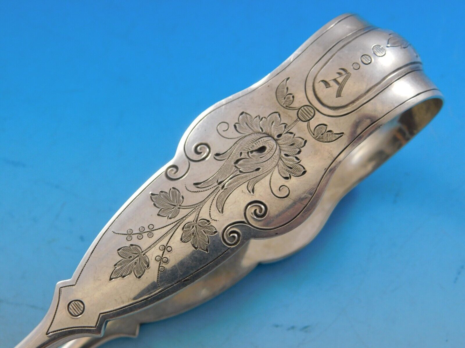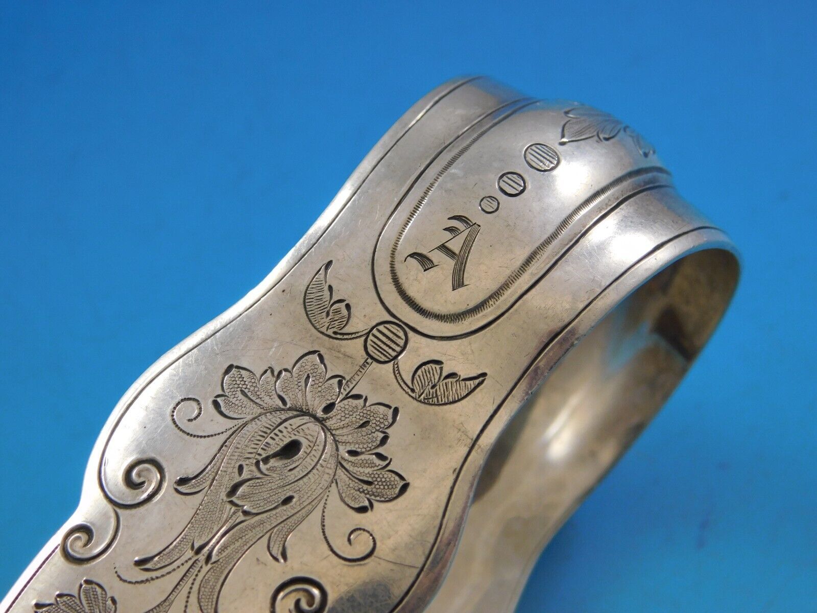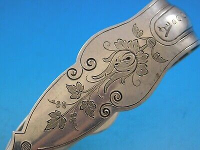 Early handmade Sterling Silver bright-cut unmarked ICE TONG 9 1/4" WITH FANCY CAST SERVING AREA DATED 1869. It is monogrammed (with an "A" and an inscription on the inside of the handle) and is in excellent condition.