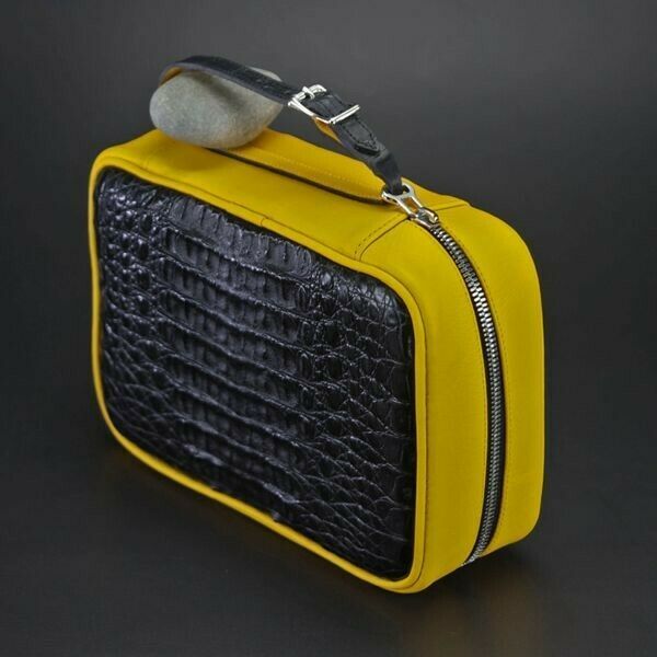 The Brizard Genuine Black Caiman Alligator and Yellow Leather Traveler Case is a high-quality and stylish accessory for any cigar enthusiast. Handmade in the United States, this case features a genuine black caiman alligator and yellow leather construction, adding a touch of luxury to your cigar storage. With its secure design and large capacity, this case is perfect for protecting and transporting your favorite cigars in style.
