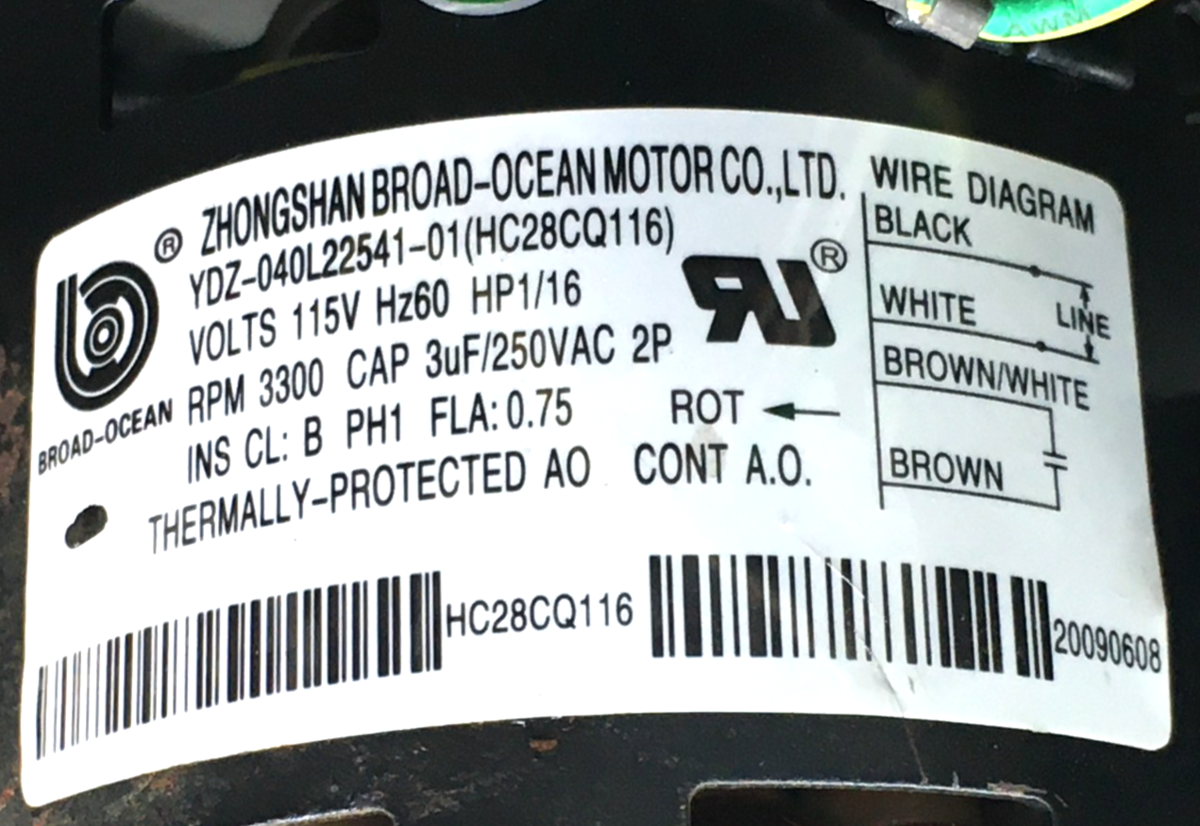 This is Broad-Ocean YDZ-040L22541-01 Furnace Inducer Motor Carrier HC28CQ116 3300RPM 115V 1/16HP 60Hz used part.