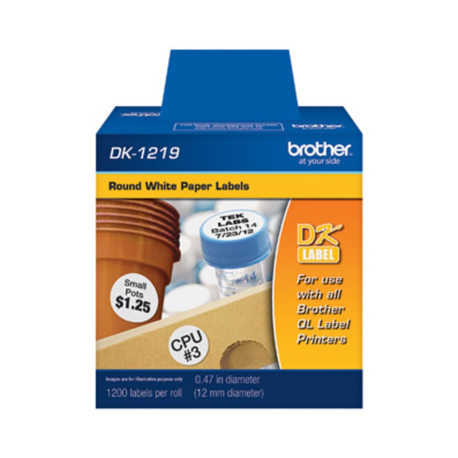 Product description: BRTDK1219 Features: -Package: Includes one roll.. -Pre-Consumer Recycled Content Percent [Nom]: 0 %. -Shape: Round. -Adhesive: Permanent Self-Adhesive. -Post-Consumer Recycled Content Percent [Nom]: 0 %. -Labels Per Roll [Nom]: 1200. Type of Labels: -Label Printer Labels. Labels per Pack: -1,000-5,000. Size: -0.5 round. Dimensions: -Label Size - text: 1/2'' dia.. Overall Height - Top to Bottom: -4.8". Overall Width - Side to Side: -4.5". Overall Product Weight: -1 lbs.
