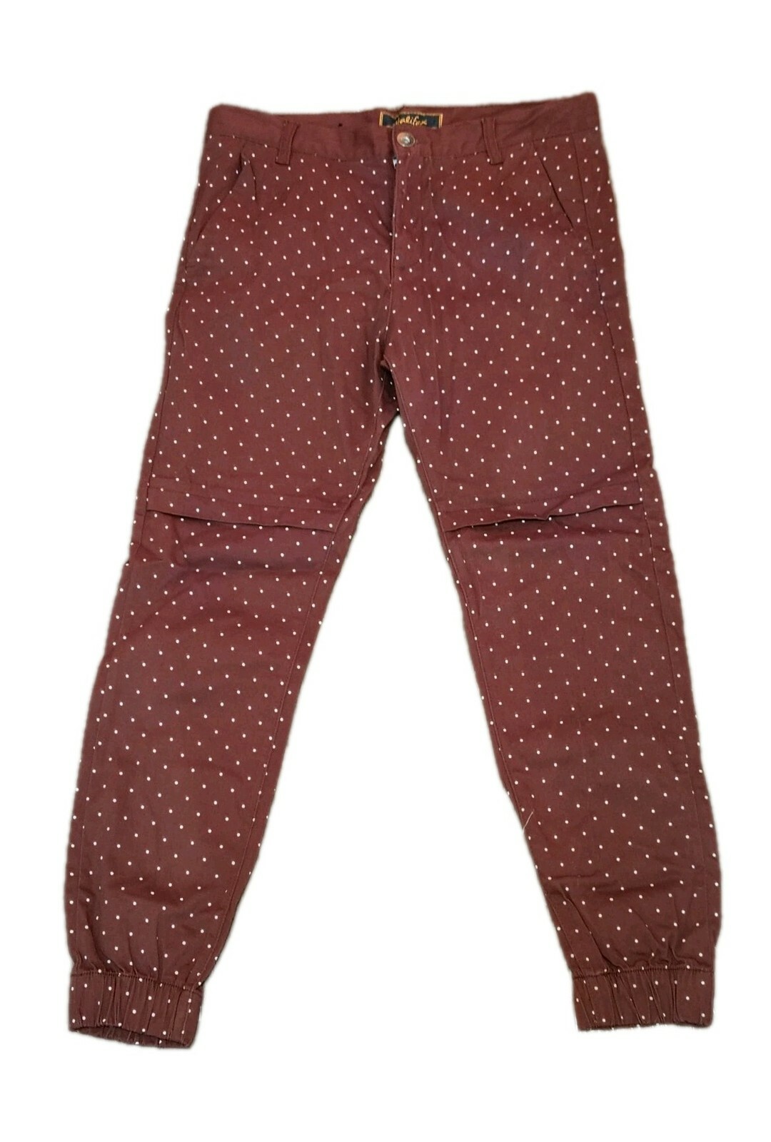 These Brown/White Polka Dot Casual Pants by Halifax are a stylish and comfortable choice for a casual occasion. Made from a blend of spandex and cotton, they feature a zip and button closure, a mid-rise fit, and a tapered leg style. The vintage-inspired design adds a unique touch to the jogger-style pants, which are machine washable for easy care. With a size W36x29, these pants are perfect for the fall, winter, and spring seasons and come with pockets for added functionality. Made in Vietnam, they offer a regular fit for both men and women.