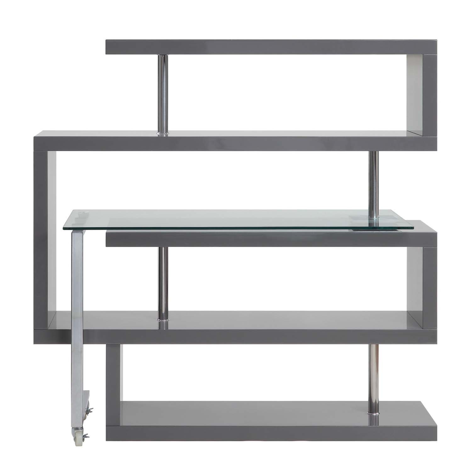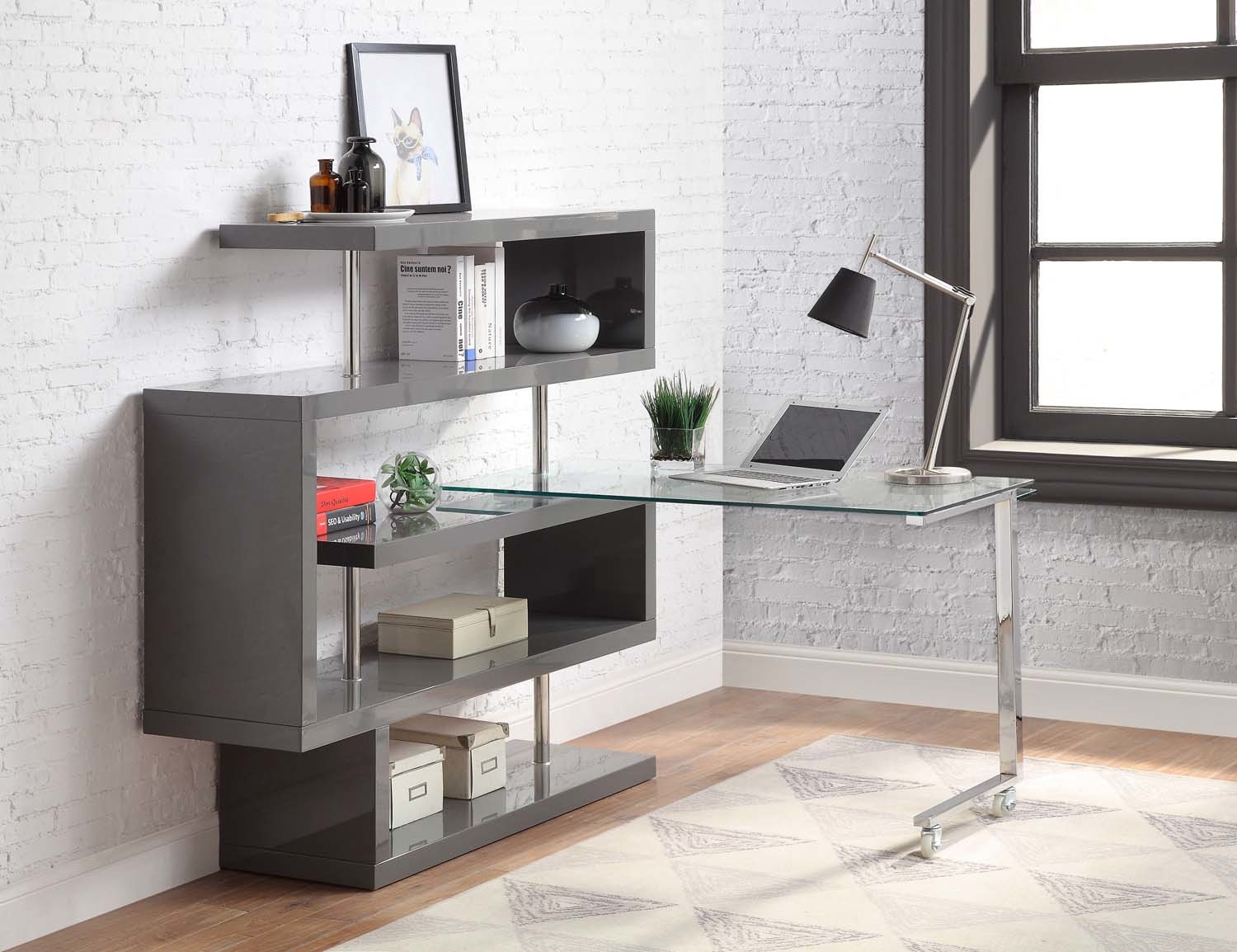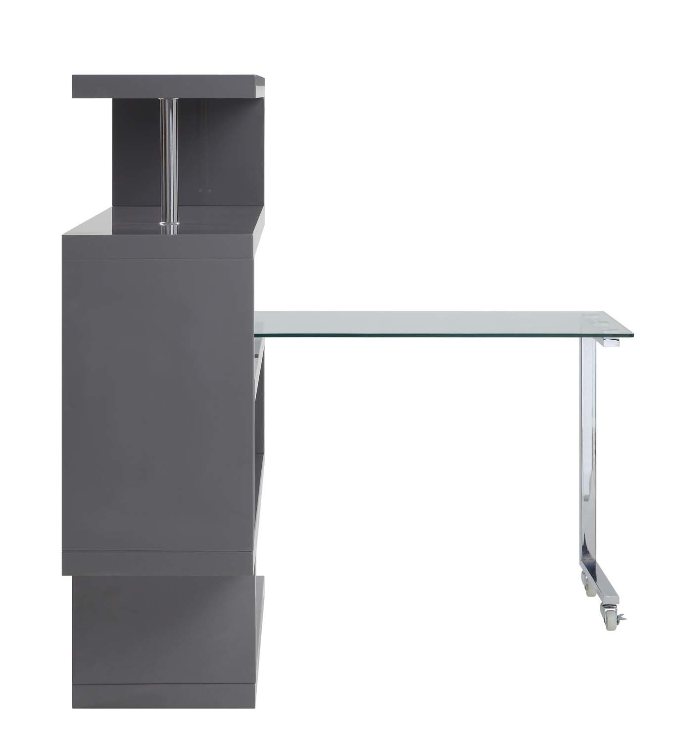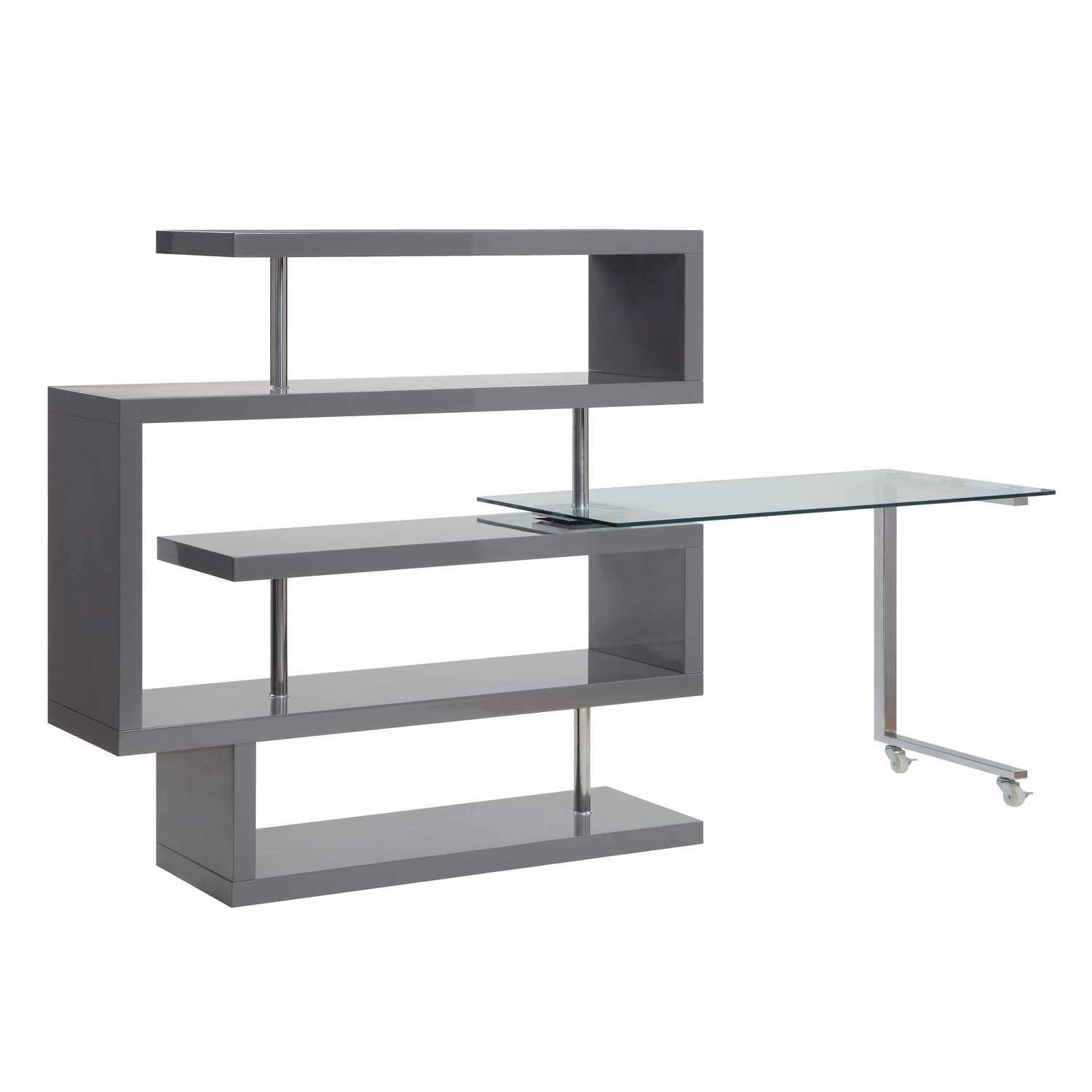 - Buck II Writing Desk w/Bookshelf, Clear Glass, Chrome & Gray High Gloss Finish