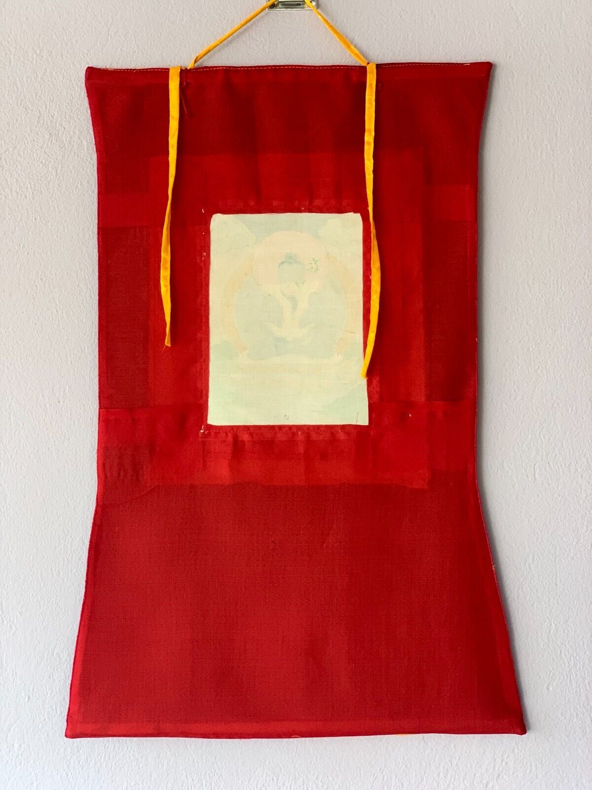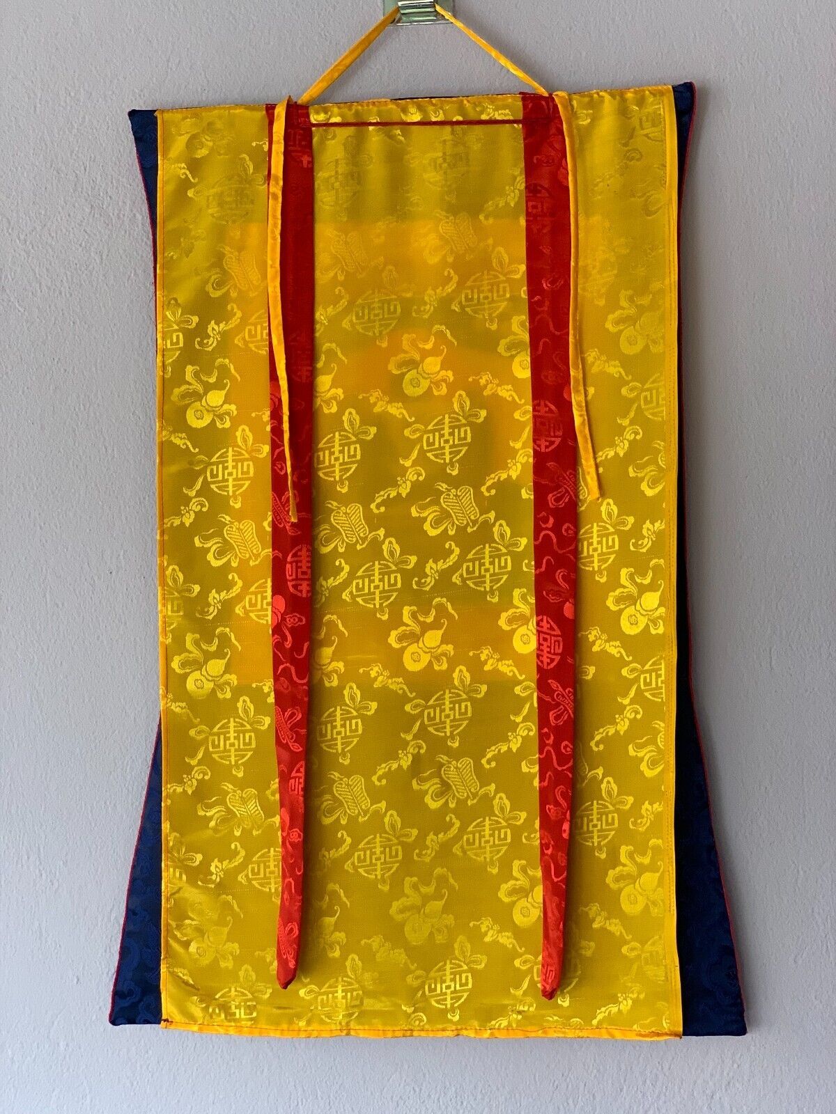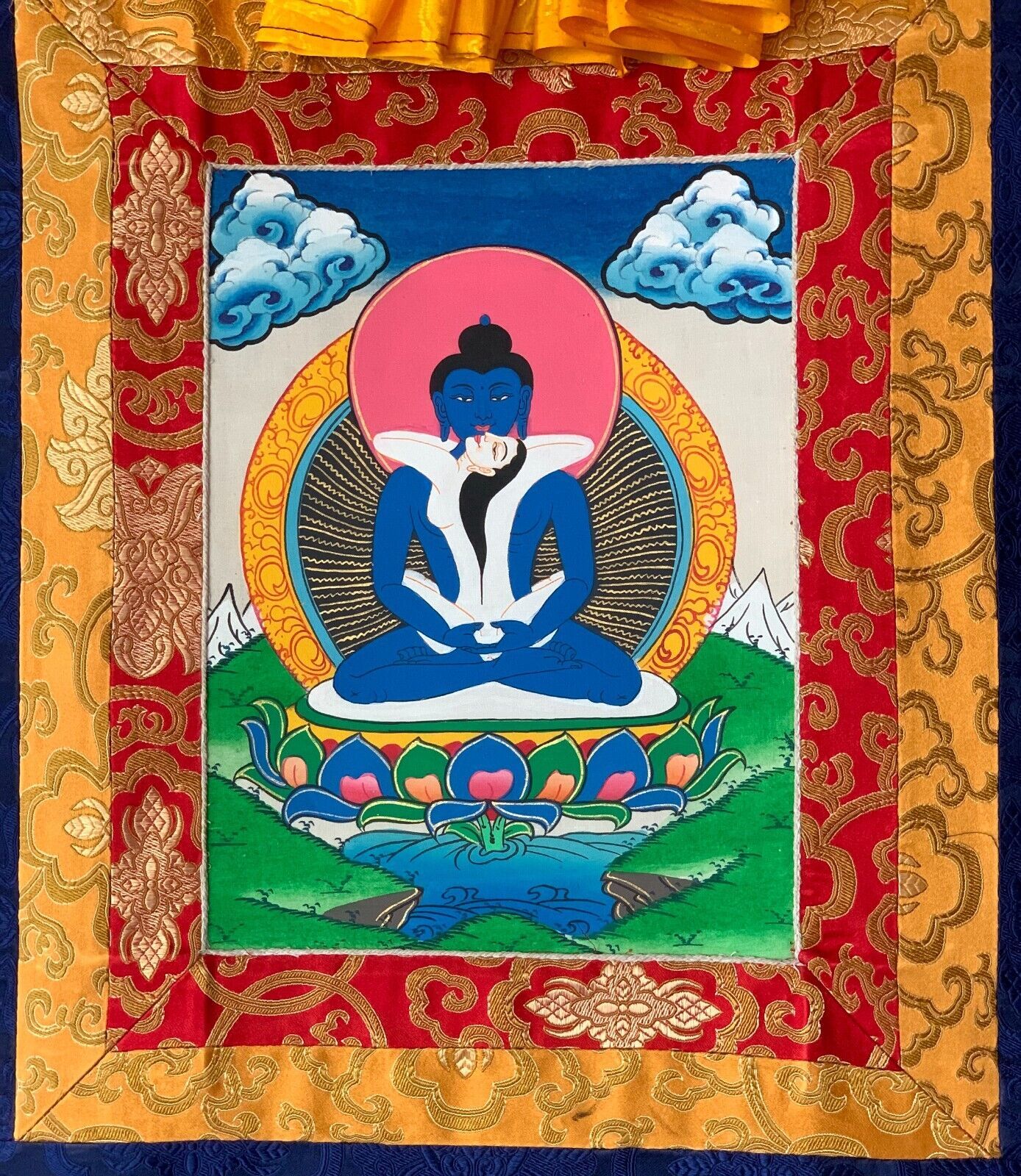 HAND-PAINTED SAMANTABHADRA TIBETAN THANGKA, THANKA PAINTING, WITH SILK BROCADE