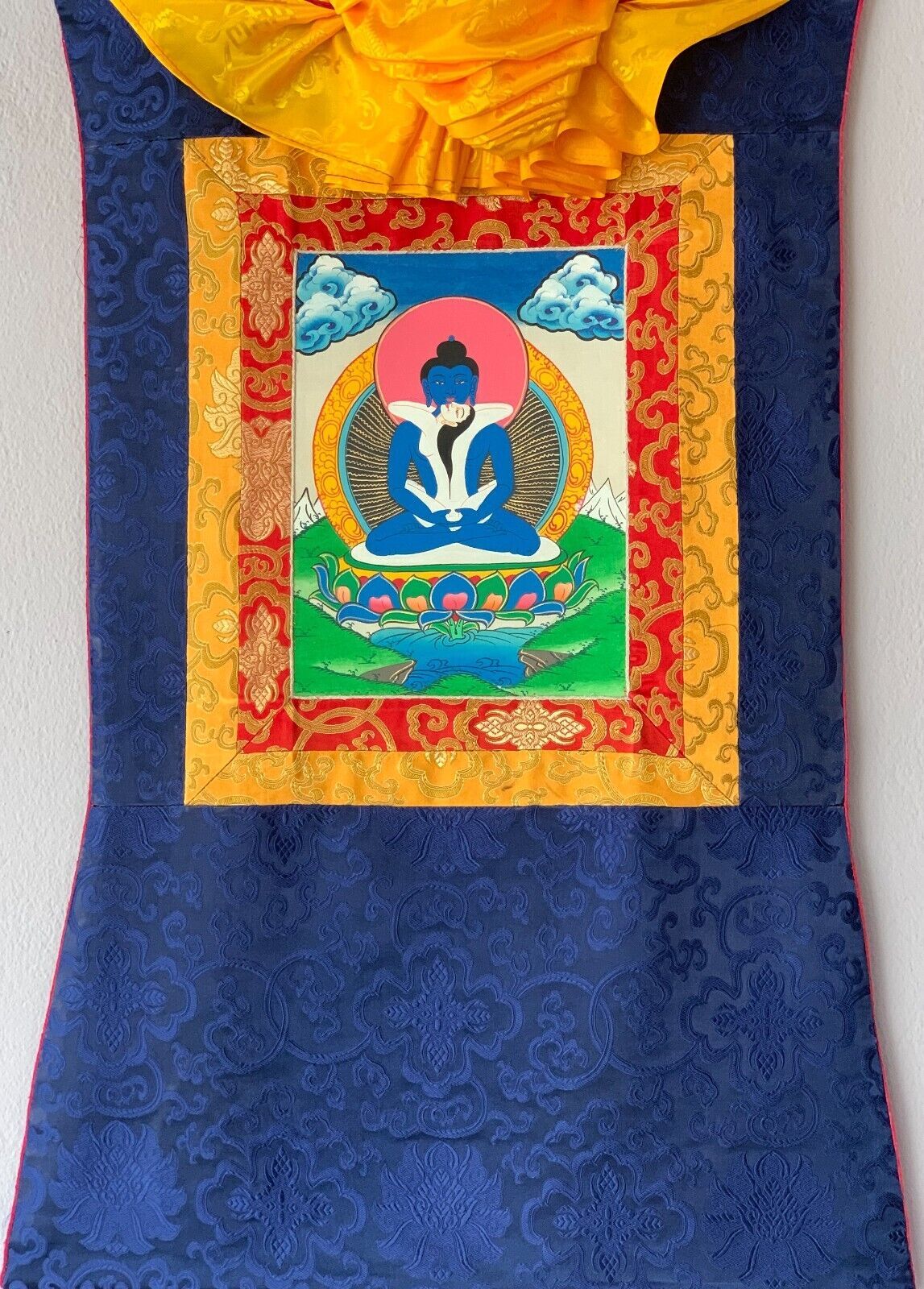 The Samantabhadra is Bodhisattva associated with Buddhist practice and meditation. Samantabhadra is described as the ?primordial Lord of unchanging light, the central origin of all mandalas, possessing the ocean of knowledge and pristine awareness?. In this thangka painting, Buddha Shakti is depicted embracing his consort Samantabhadri in Yab-Yum, the sacred union. The color of his skin is Always blue and he sits naked in a 'vajra' posture, with his two hands placed on his lap in the gesture of meditation. The deities at the bottom are Vajrapani And Chenrezig. Buddha Shakti is the representation of the original nature of the mind and a symbol of unity between awareness and compassion.