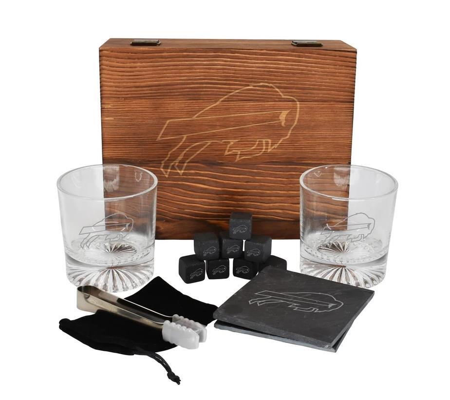 Buffalo Bills Drinkware Set Glasses Wood Box Coasters Cooling Cubes NFL