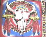 It is BURGUNDY YELLOW BLACK BLUE WHITE with A BUFFALO HEAD SKULL WITH FEATHERS and TRIBAL DESIGN BACKGROUND BY hogwear (Trademark)