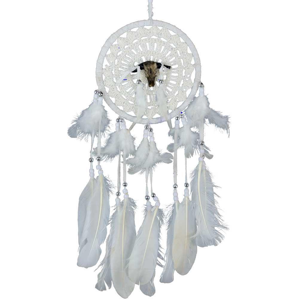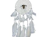 A buffalo skull charm has been woven into the center of this crocheted dream catcher's web and elegant, white feathers hang from white beaded strands. This breath taking dream catcher completely captures the imagery of the great buffalo spirit.