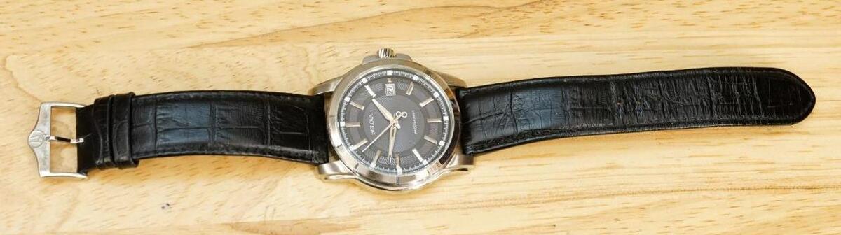 Bulova Precisionist Gray Dial Silver Tone Black Leather Band Men's Watch 96B158 - crisp and clean. Direct from a local estate. Does need a new battery. No smoke or pet odors.