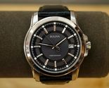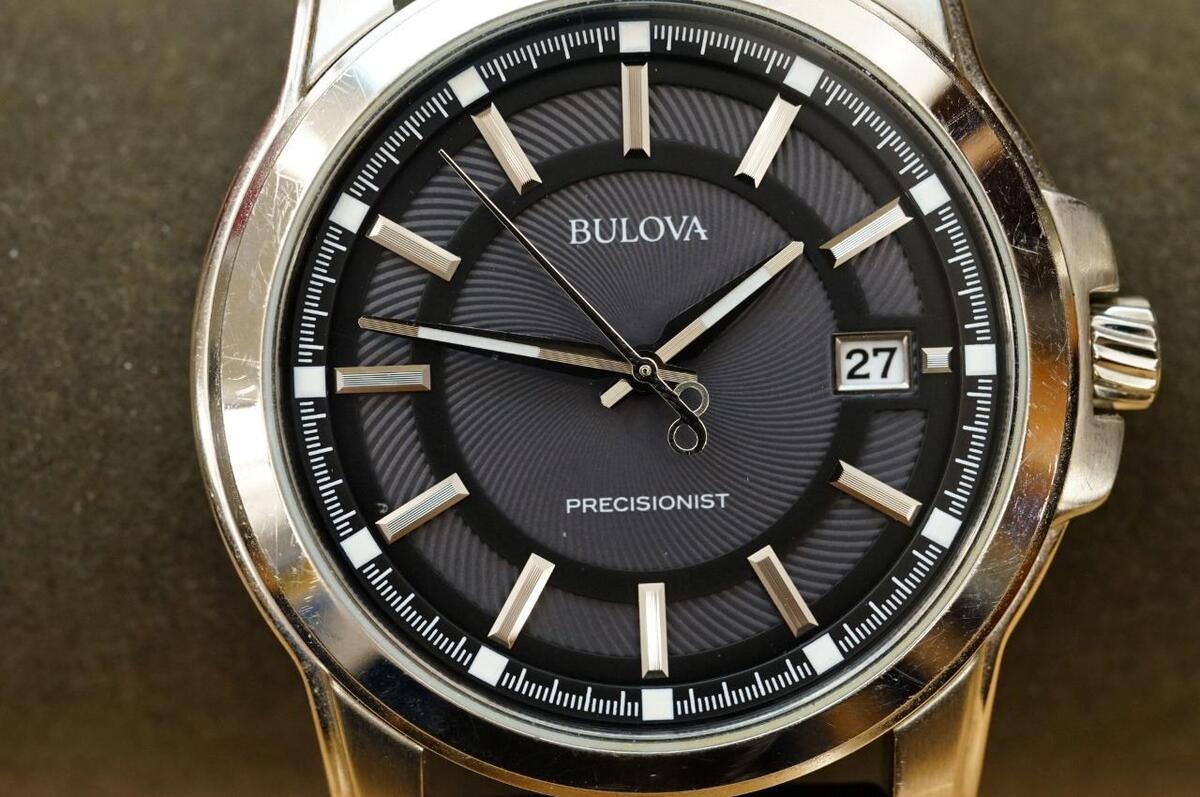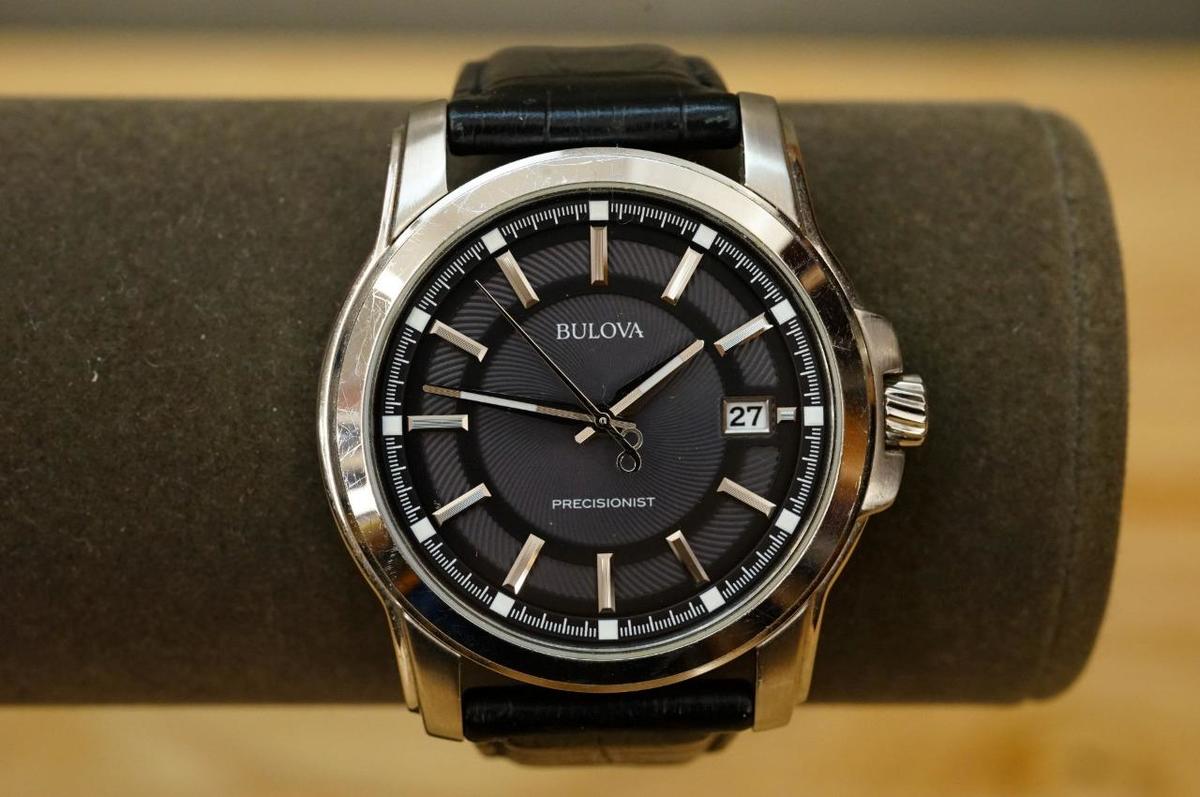 - Bulova Precisionist Gray Dial Silver Tone Black Leather Band Men's Watch 96B158