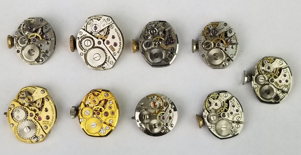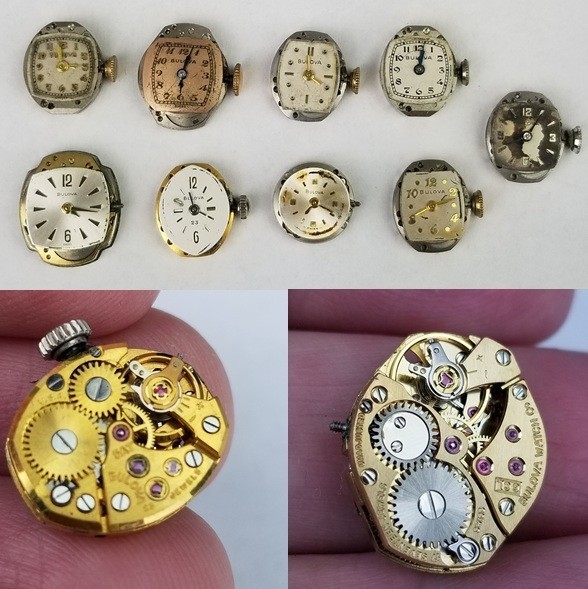 Different shapes and sizes. All originally from 1950's-1960's Bulova ladies watches. Most are 17j but there are some 21j and a 23j.