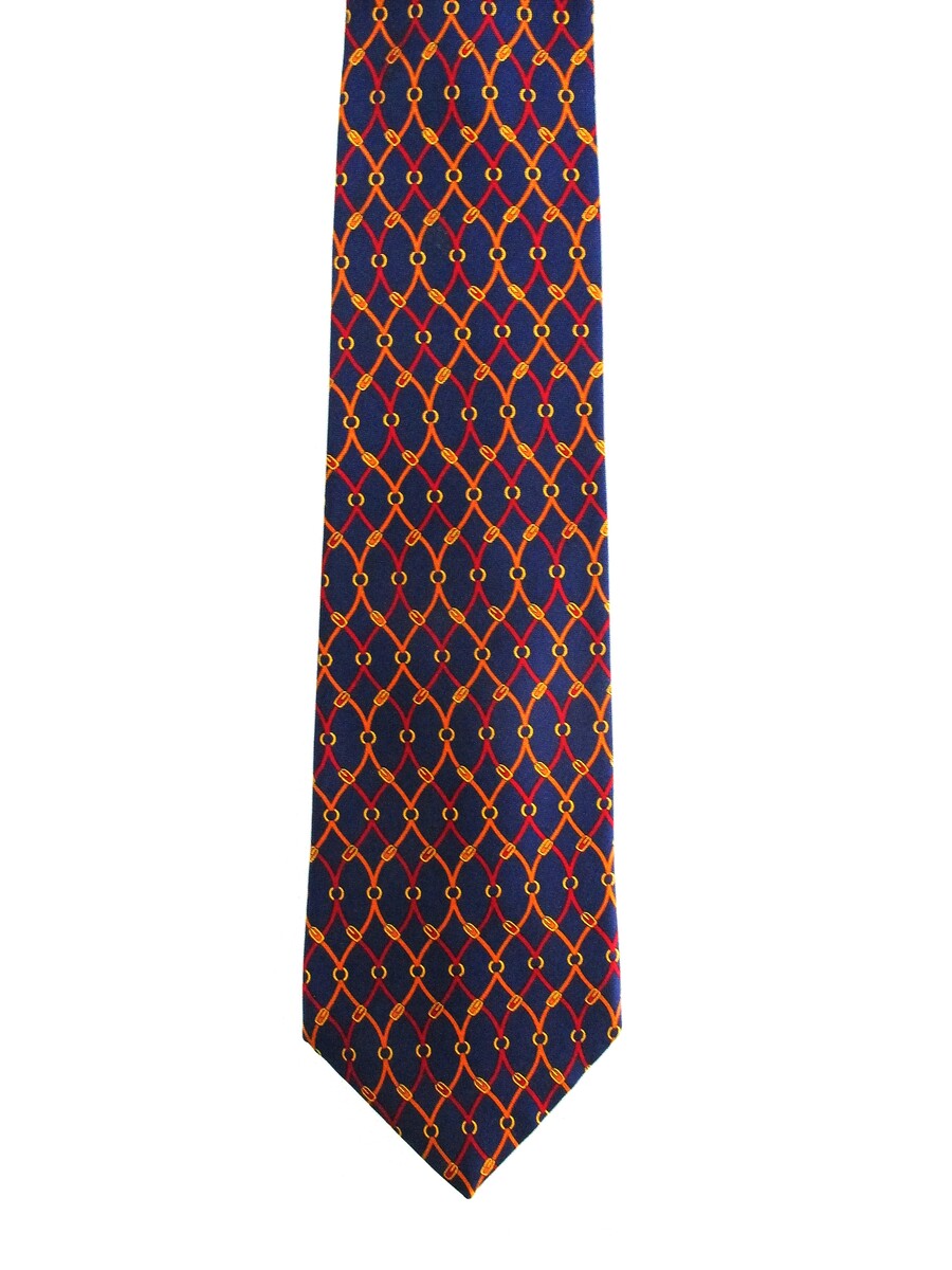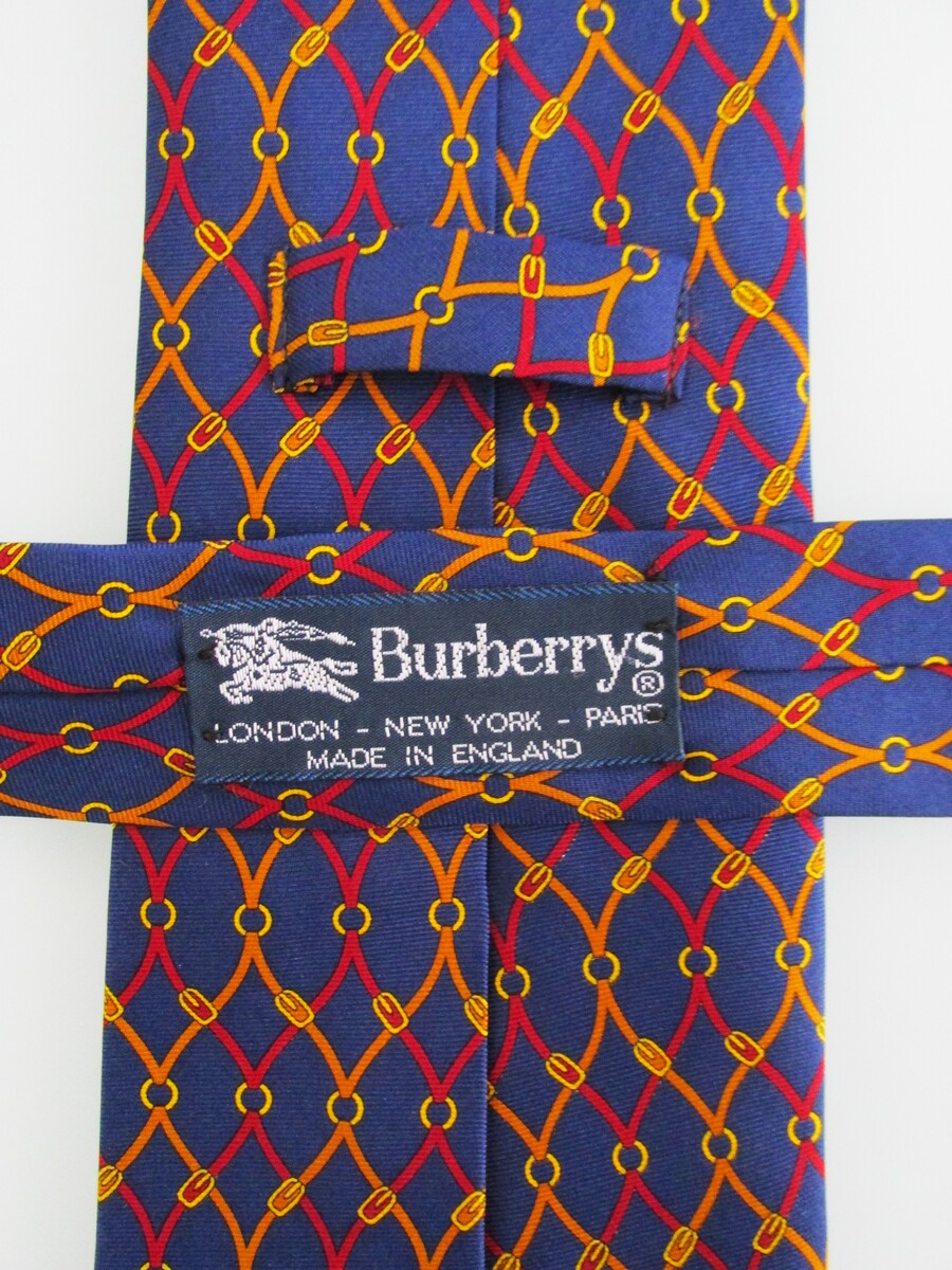 Description: Up for sale is a Burberry designer men's silk tie. The tie is handmade in England of 100% silk. The tie has a red gold belt and buckle pattern on a navy blue background. Dimensions are approximately 58" long x 3.75" wide. This tie is in excellent condition.