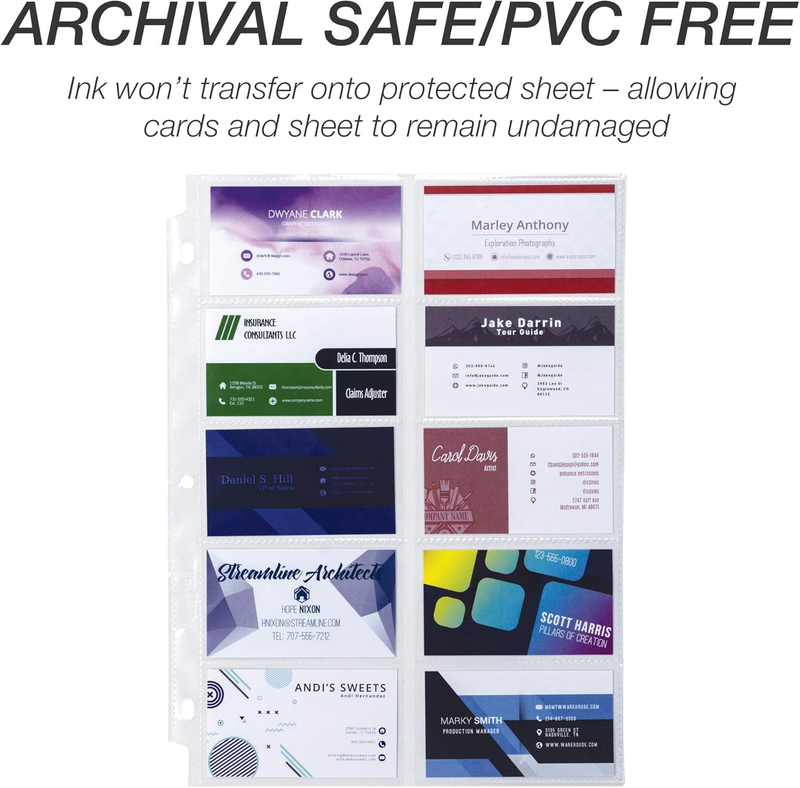 Achieve superior protection for business cards with these heavyweight clear business card protector sheets. Available in a value pack of 25 clear insert sheets, these plastic sleeves help you protect individual business cards from dirt, debris, liquid and other contaminants while ensuring excellent readability to the materials inside. Each business card page is perfectly sized to hold 3.5? x 2? cards in any standard three-ring. Each double-sided page is designed to hold 20 cards (10 on each side) for added capacity. Samsill heavy duty clear business card pages are made of durable and high-quality PVC-free, non-stick polypropylene material that keeps your valued cards/contacts safe and organized in a busy work, home, or school environment. Not only they remain protected from spills, dirt and smudges, the clear polished finish also maintains a crisp and clear view of the content inside. The acid-free and archival safe polypropylene will not lift or transfer ink or photocopy in any way. Each heavy-duty card protector meets industry standards and measures 3 mil or .076mm thick to ensure superior performance and strength.The professional clear protective sheets feature side-loading orientation that allows quick adding or removing of cards. All the business card protector sheets feature three pre-punched holes at the edge to allow easy storage and organization. They can easily fit into any 3-ring binder.