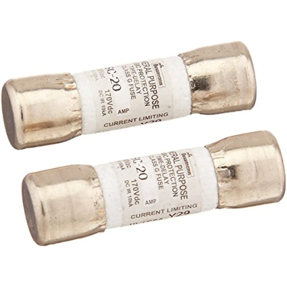 Product Description Bussmann BP/SC-20 20 Amp Time-Delay Class G Melamine Tube, 600V UL Listed Carded, 2-Pack From the Manufacturer Specialty Class G SC Rejection Fuse. These highly compact branch circuit fuses are used in residential, mobile home and industrial applications. They have a minimum 300 volt rating and are available up to 60A. All SC fuses are 13/32-Inch in diameter with varying lengths to provide a rejection feature that prevents over fusing (Example: installing a 30 amp fuse in a 20amp circuit). One half to 6 amp SC fuses are fast-acting, while 7 to 60A SC fuses are time-delay to permit temporary overloads to pass without nuisance openings. Cartridge fuses are used to protect motors and branch circuits where higher amps or volt ratings are required. They are available in a wide variety of sizes, amp and volt ratings up to 600Vac and 600 amps. Cartridge fuses are used extensively in commercial, industrial and agricultural applications as well as residential fuse panels, air conditioning, pumps, appliances and other equipment. Cartridge fuses are available in two types. General Purpose fuses have no time-delay and protect fuse panels, appliances and branch circuits. Heavy- Duty fuses have a time-delay feature, allowing momentary motor startups. Both are available in 250Vac and 600Vac versions with catalog symbol and amp rating stamped on the knife blade or end cap.