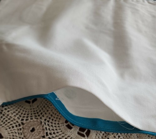 Embroidered scroll at bottom right in turquoise