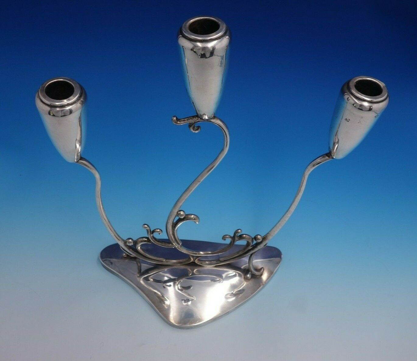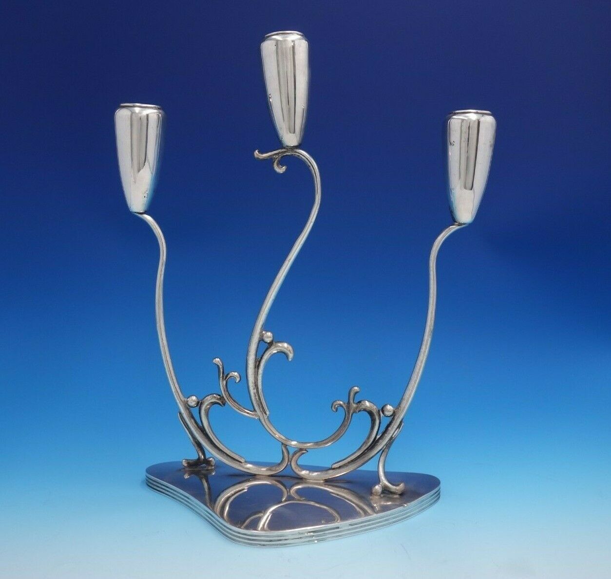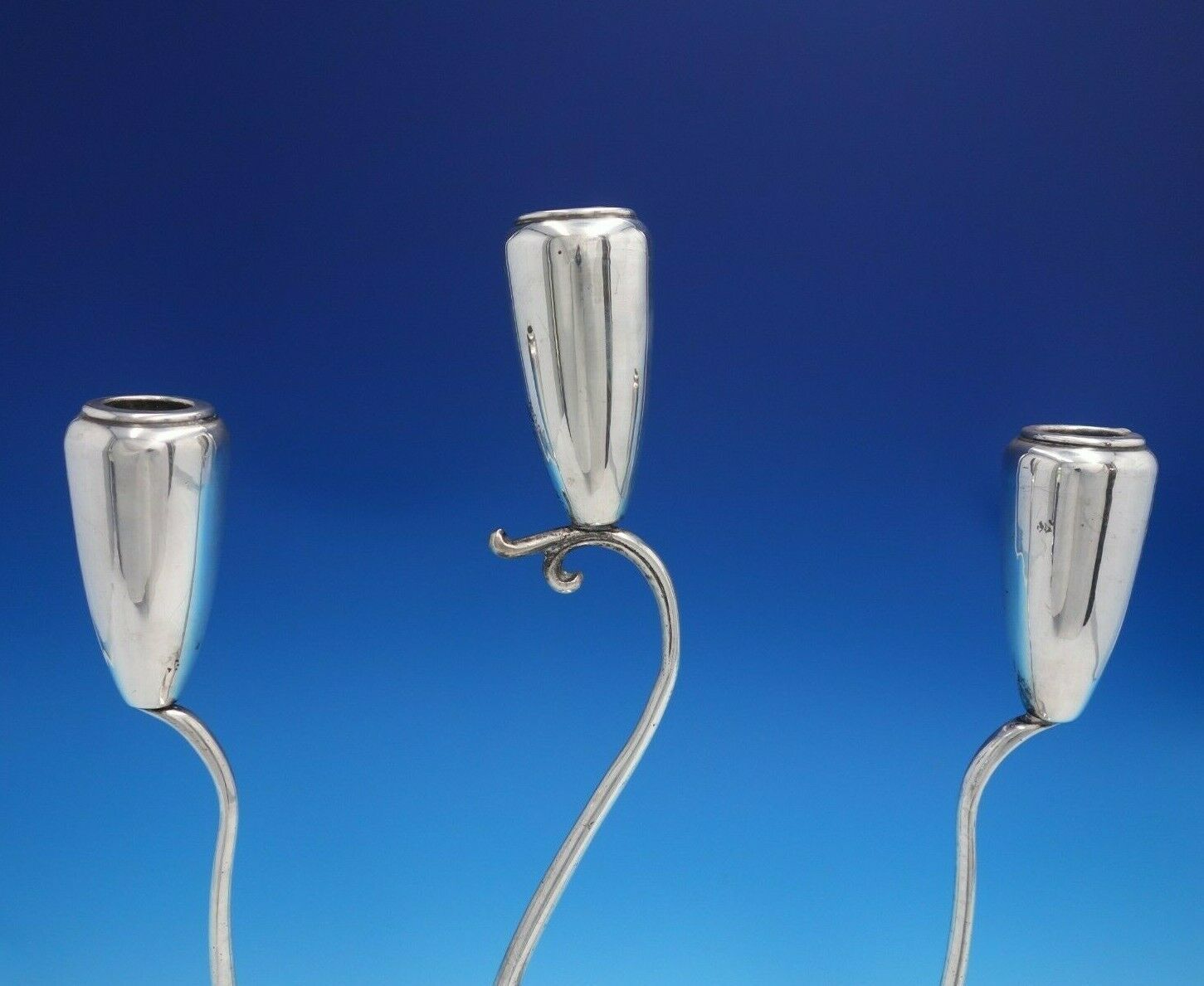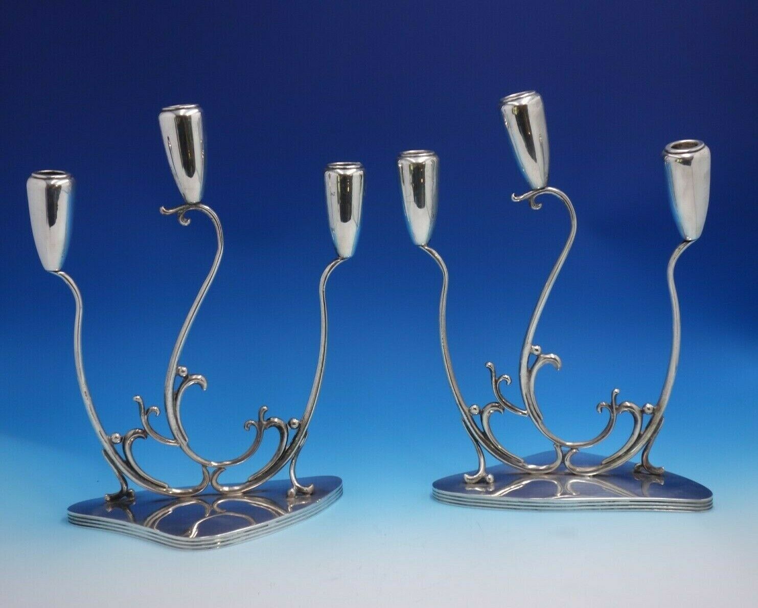 Stunning C. Zurita .925 silver 3-light candelabra pair with Modern, flowing design. These pieces measures 10" x 14" tall. Weight is 64 troy ounces. The pieces are not monogrammed and are in good vintage condition. Fabulous look!