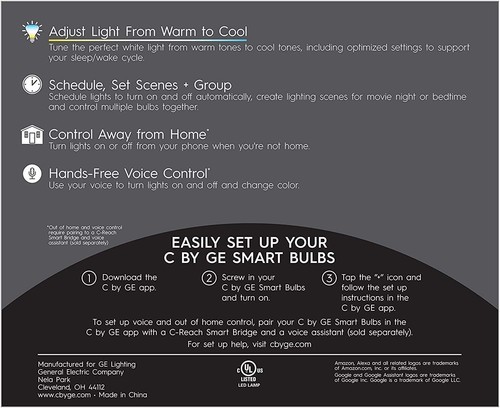 Create a lighting schedule with C by GE smart bulbs: Get added comfort and convenience by automating your smart light bulbs with iOS and Android apps, so you never come home to a dark house or disrupt your comfort from bed