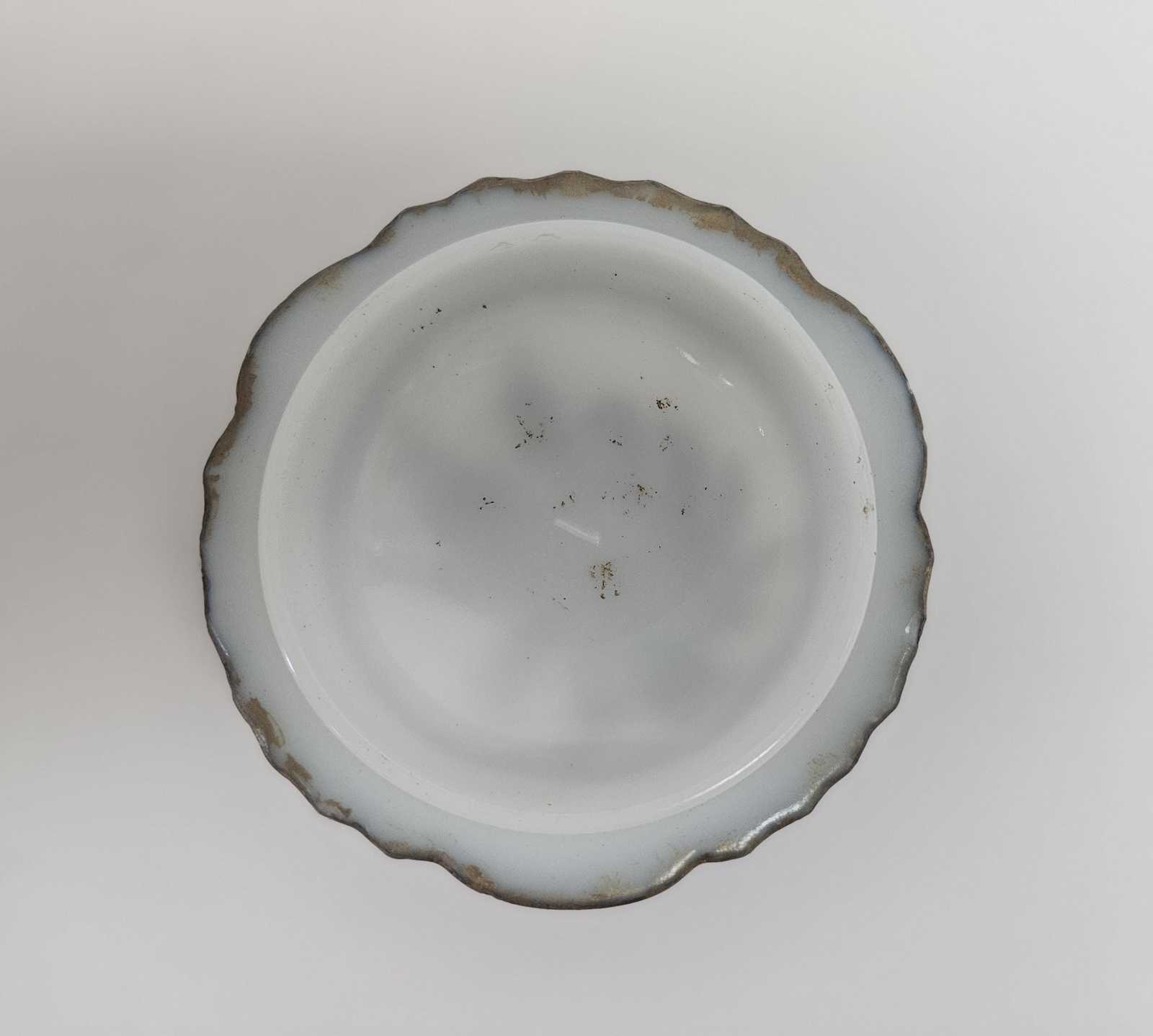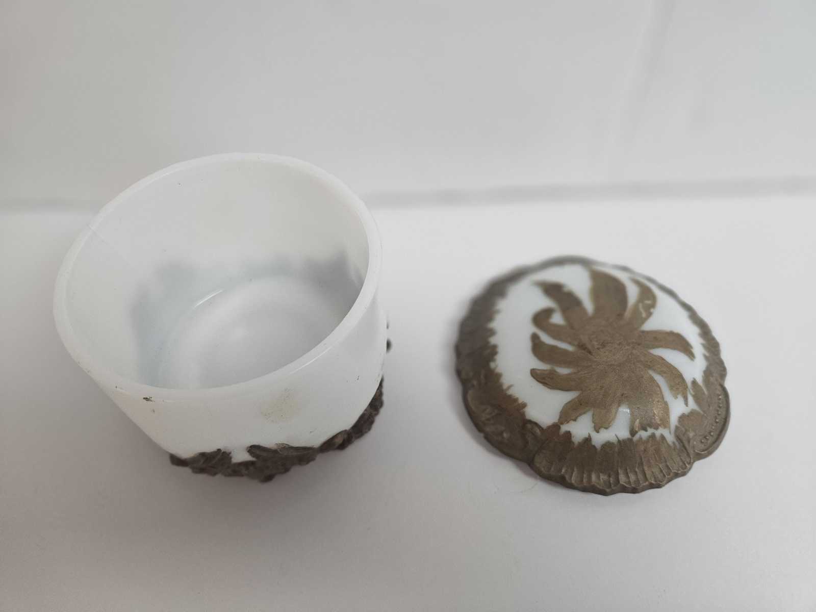 - C1900 Antique Victorian Vanity Milk Glass Powder Jar Trinket Box Handpainted Gol