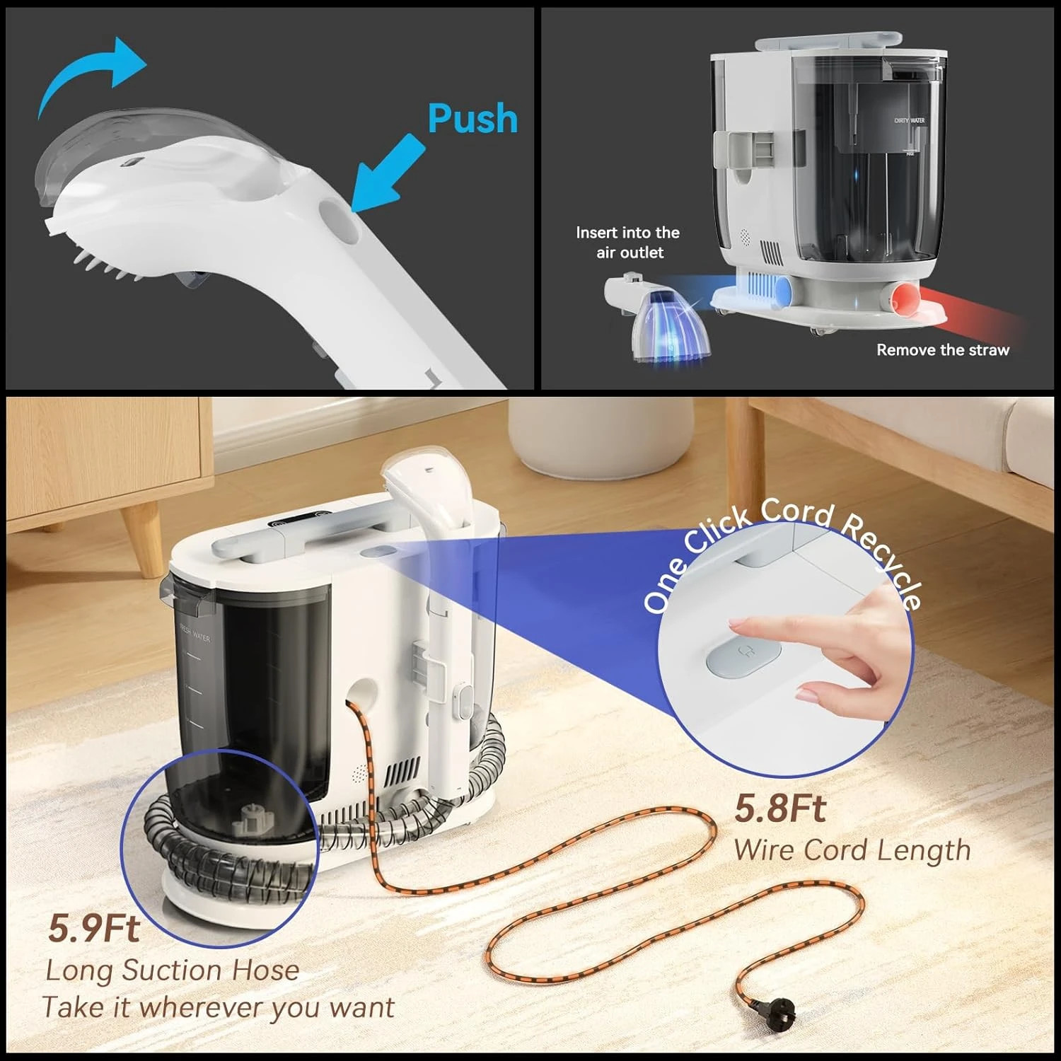? ?????????? ????????? ???? ??????:The 16.4ft power cord retracts with the push of a button for neat and tangle-free storage, making this upholstery cleaner machine incredibly user-friendly.