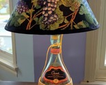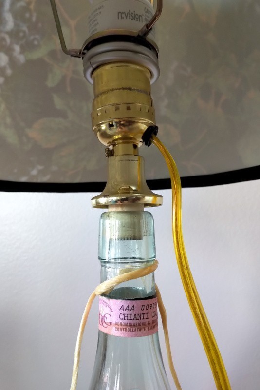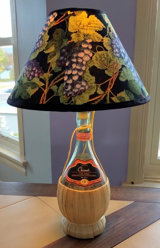 Corded electric lamp has a grapevine shade and measures approximately 16.5" tall x 11" in diameter (shade). The Chianti bottle is clear with a black/red label and the cord is gold.