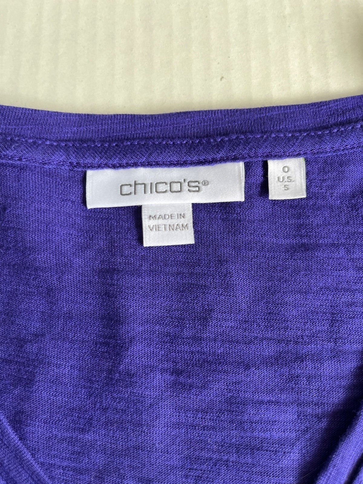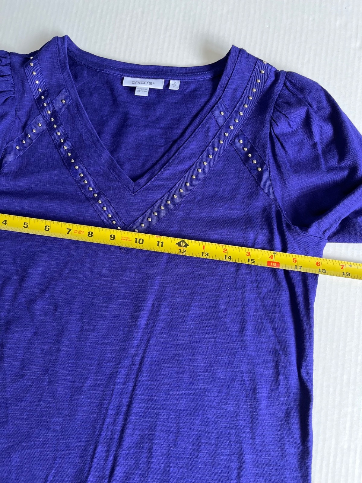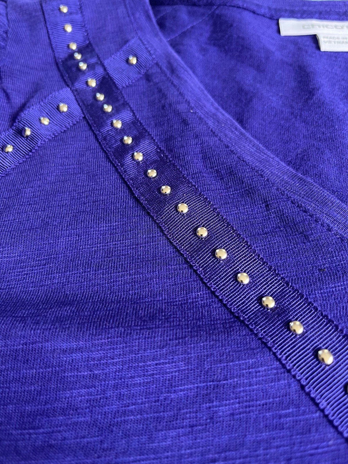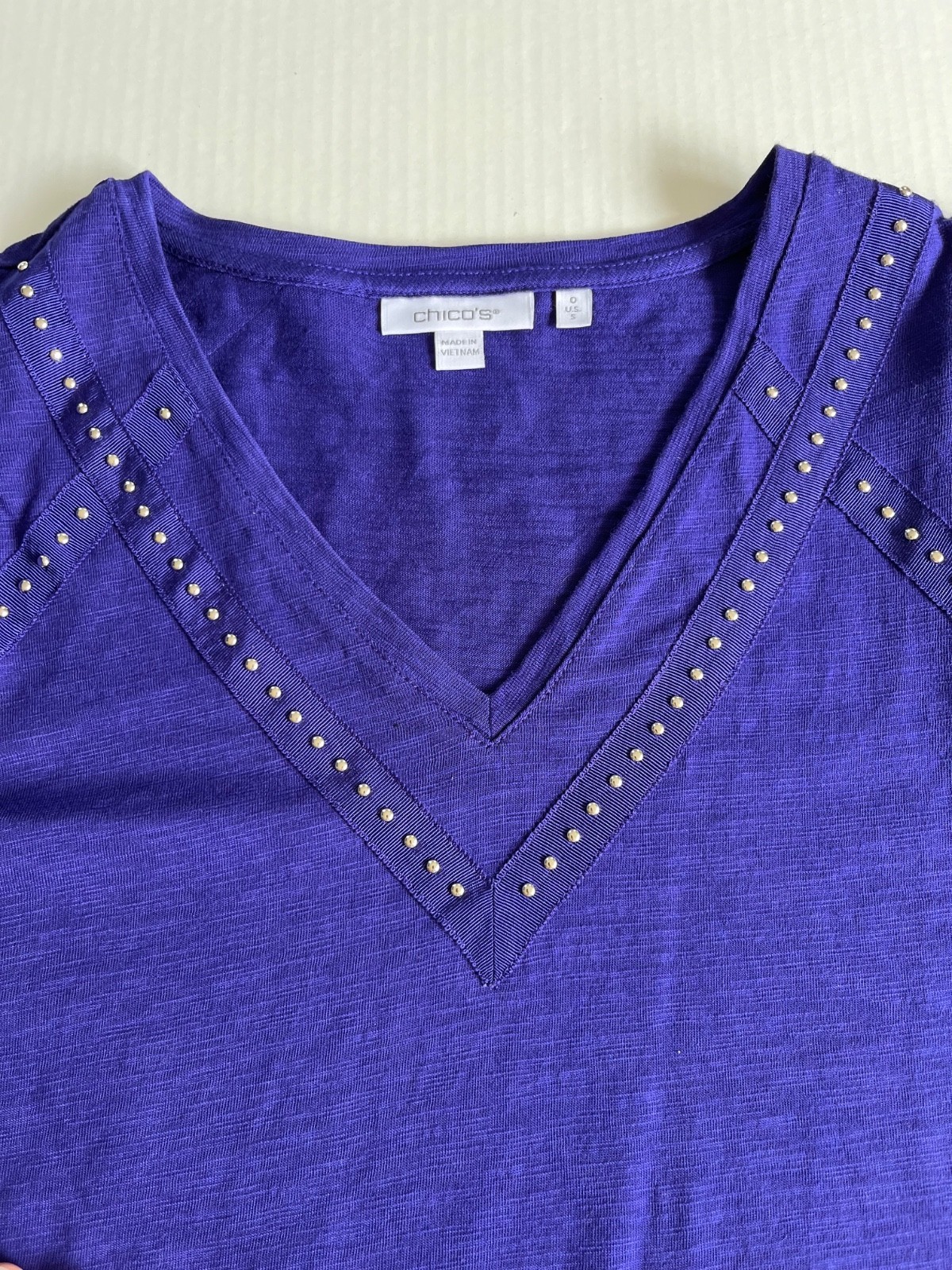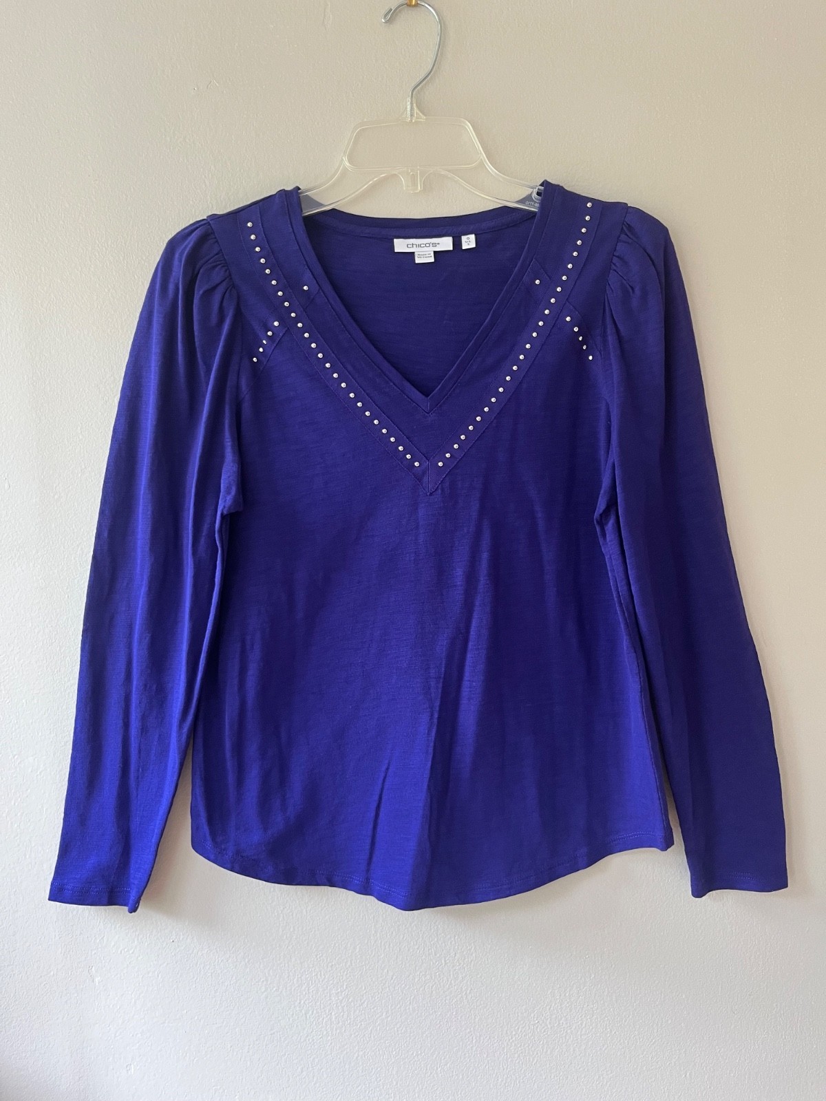 - CHICOS Sz S Blouse Purple Embellished V Neck Long Sleeve Pullover Stretch NEW