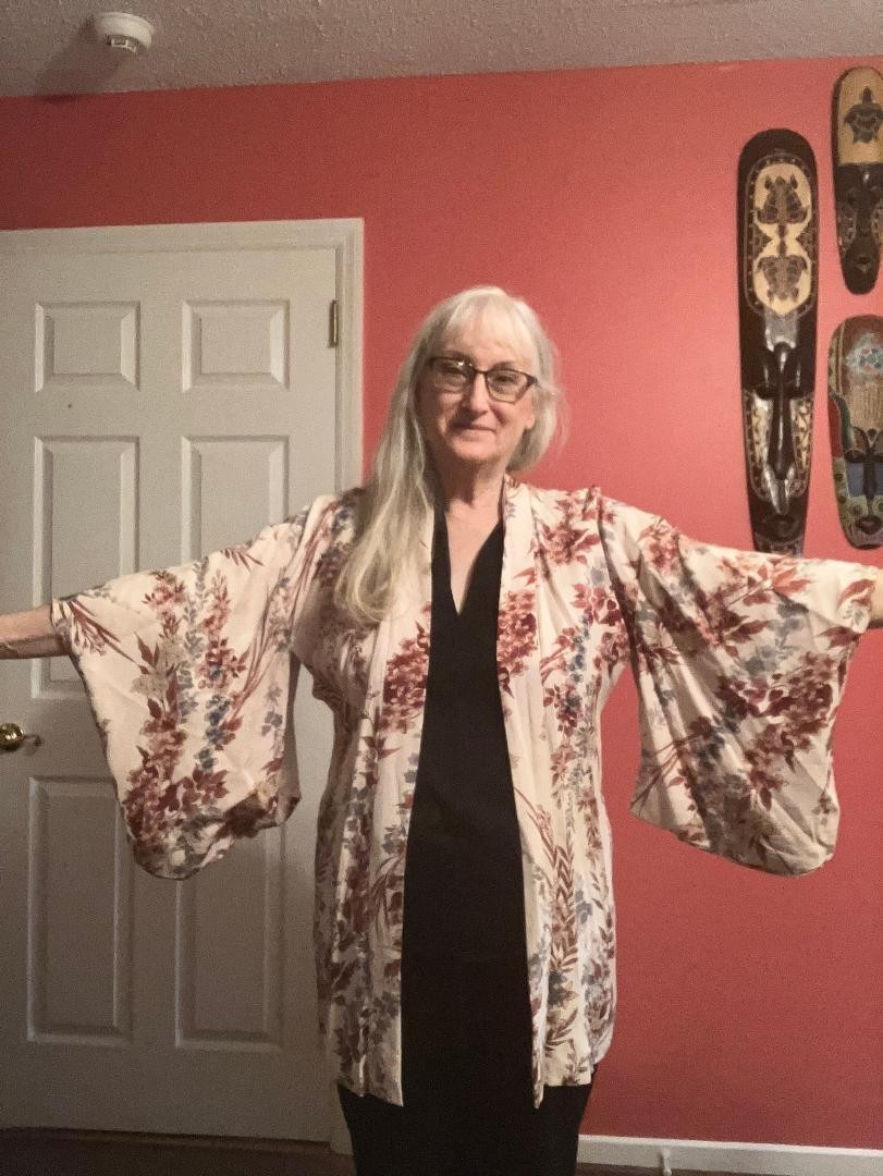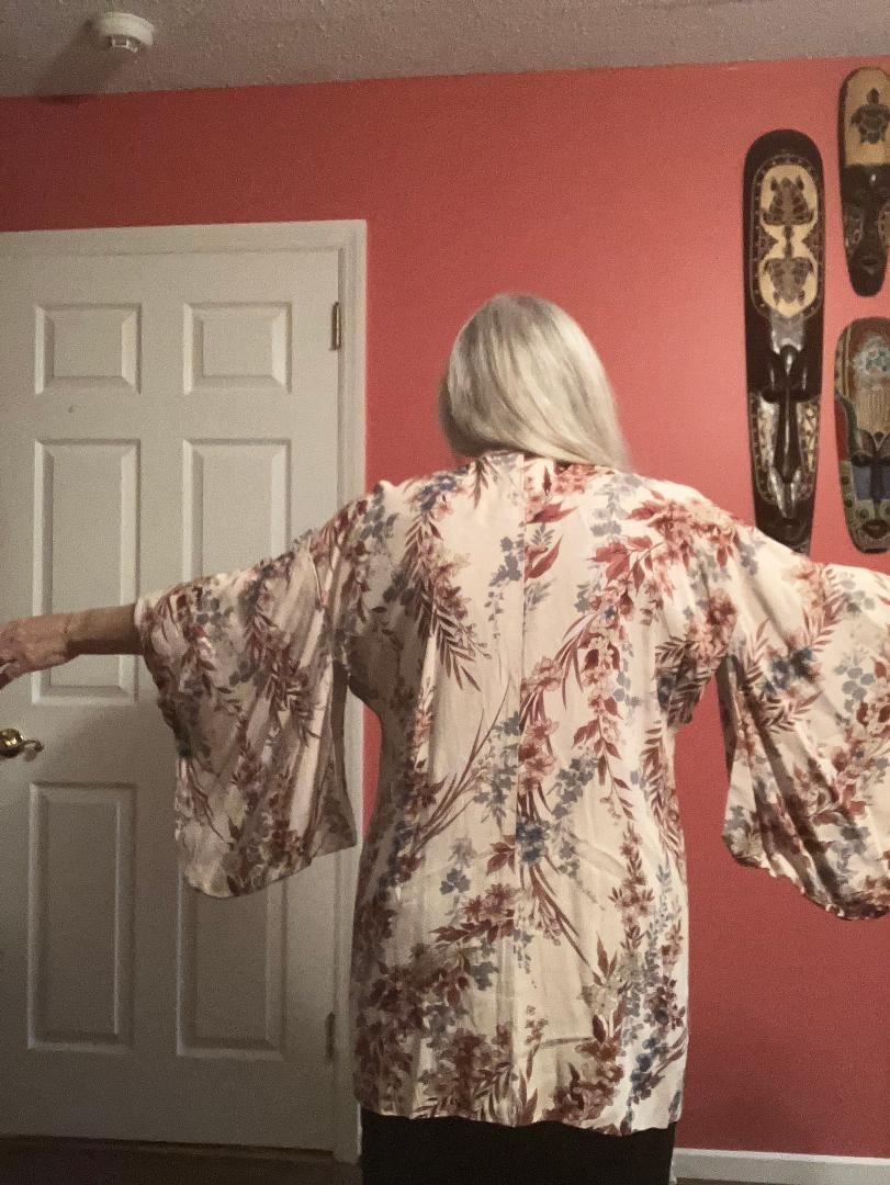 (Internal #CL-KIM-13) This is a beautiful vintage short kimono top pale yellow with brown and gold flowers and leaves and gold detailing; half-lined; fabric may be silk; no obvious tears or stains