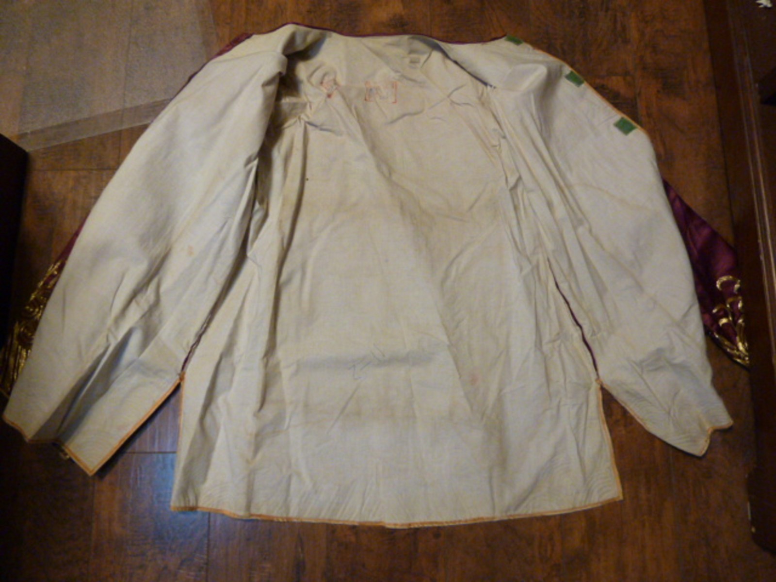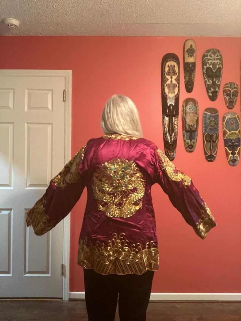 (Internal #CL-KIM-15) This is a short burgundy satin jacket, extremely detailed gold and green embroidery of dragons front, back and sleeves.