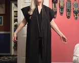(Internal #CL-KIM-6) This is a beautiful vintage long black kimono with sewn-on off-white circle design and off-white edging; no sleeves; off-white 1/4 lining top, 1/4 bottom; believe silk, believe silk; heavy weight.