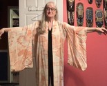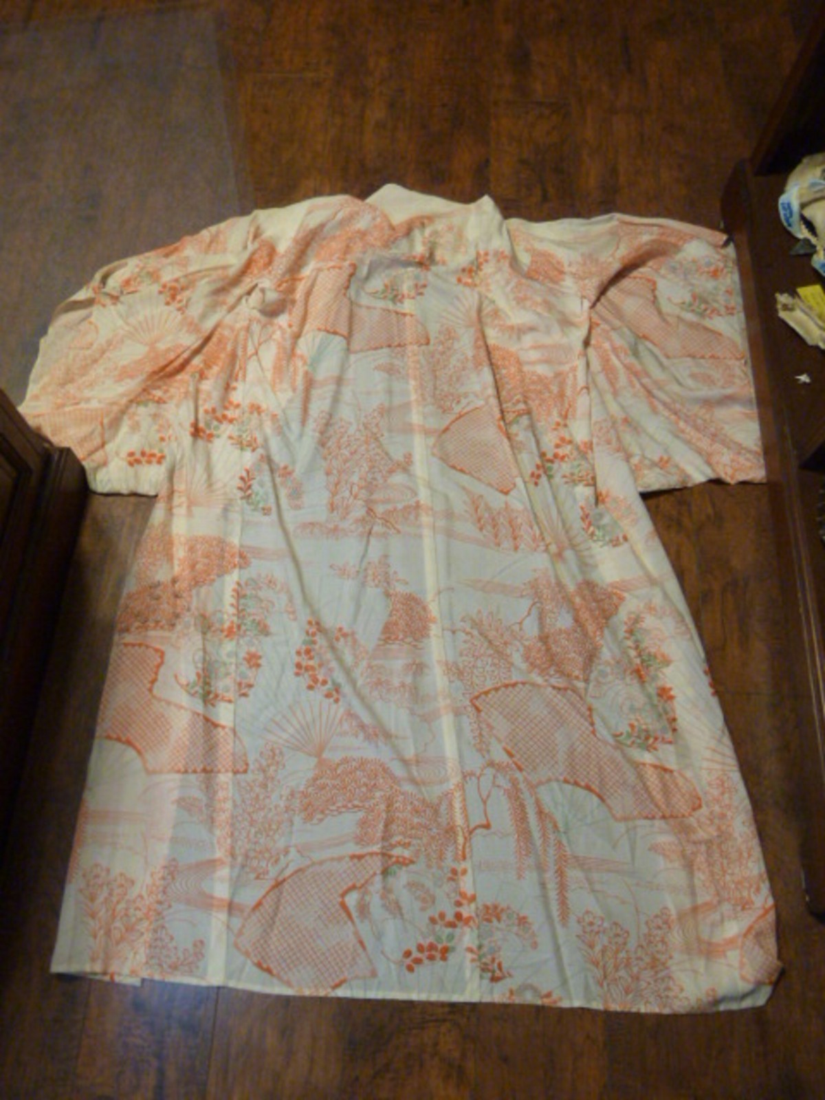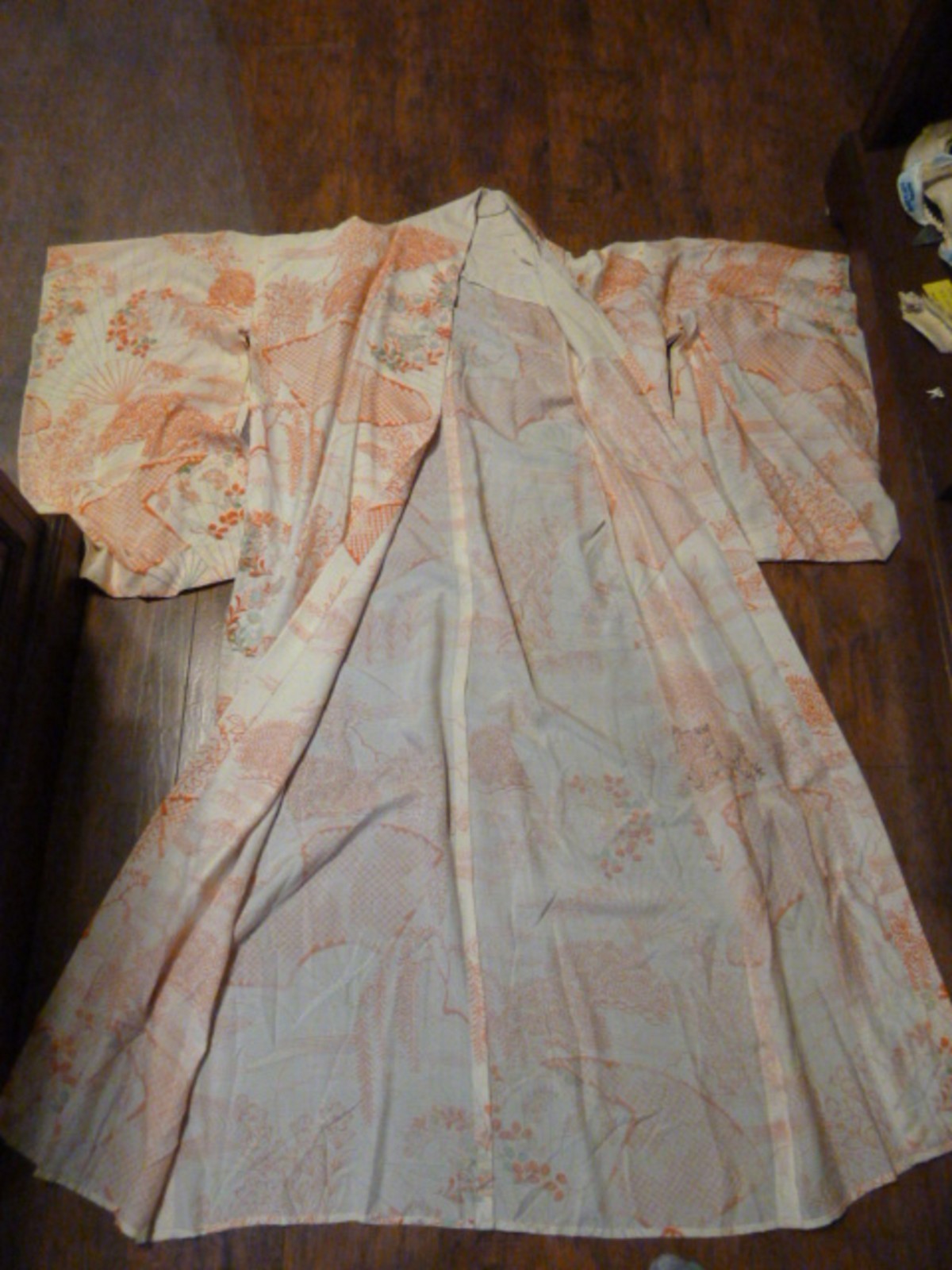 - CL-KIM-9 Pre WWII vintage long off white orange tree fan floral design Kimono Lg