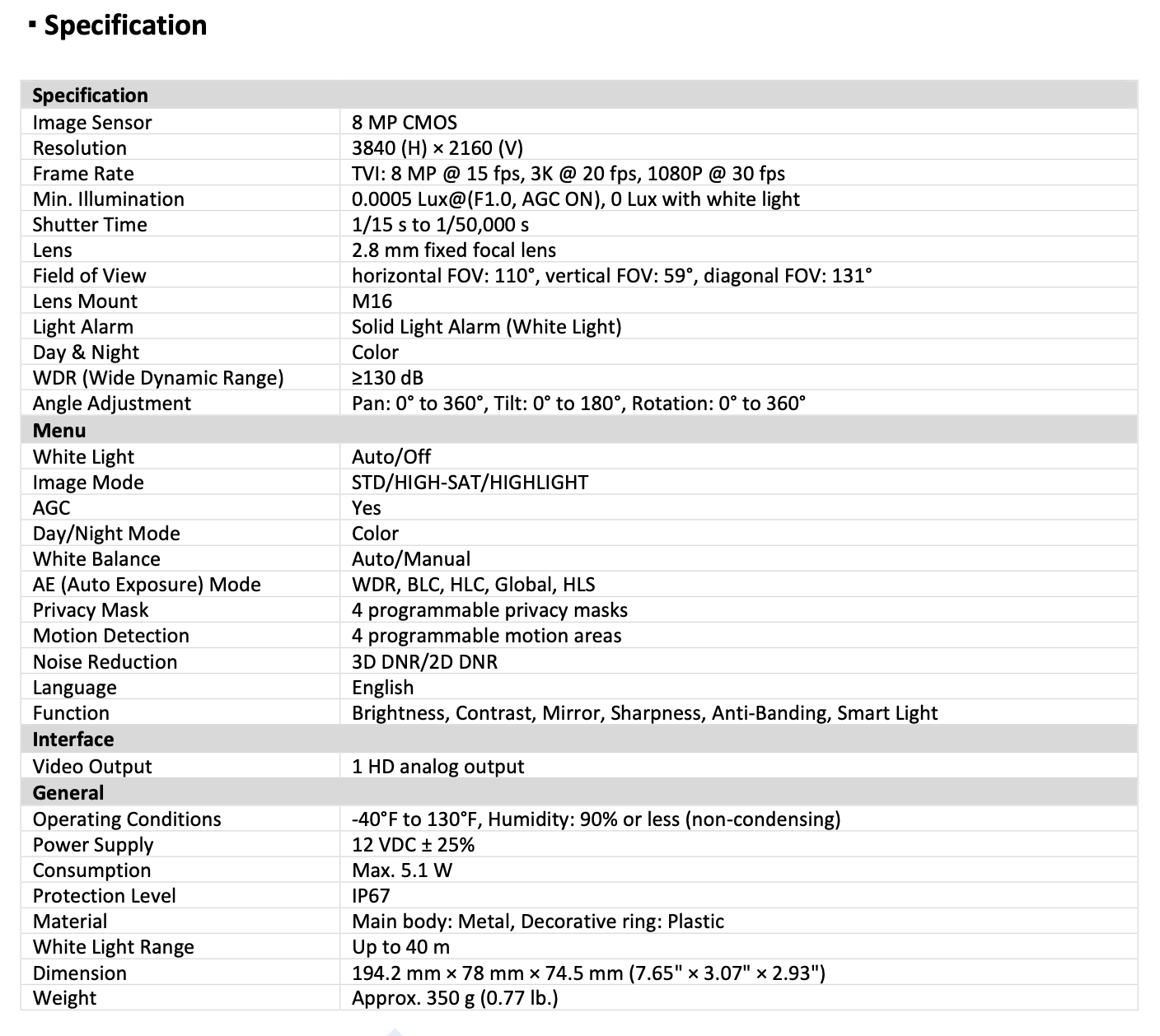 Platinum, 8MP, HD-TVI, Turret, 2.8mm, Fixed, 0.0005 Lux@F1.0, Clear White LEDs up to 131ft, True WDR 130dB, Color 24/7