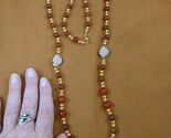 Thia is a 38" long necklace with Fairy crosses 7/8" on bottom, others 5/8", 8 mm orange Carnelian round beads; 5 mm round textured gold brass accent beads; 14k lobster claw and tab closure.