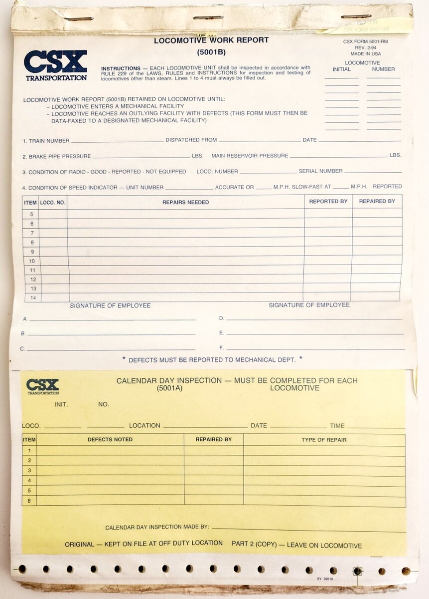 - CSX Transportation Locomotive Work Report Forms 5001B Railroad Documents DWWW1