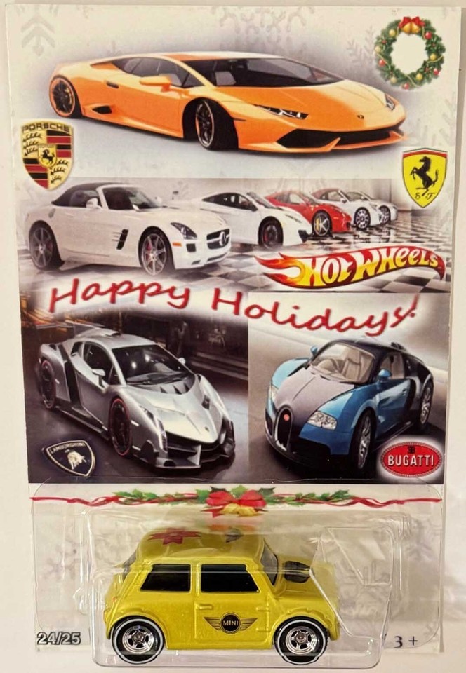 - CUSTOM Hot Wheels Yellow Morris Mini Happy Holidays Car Series w/RR