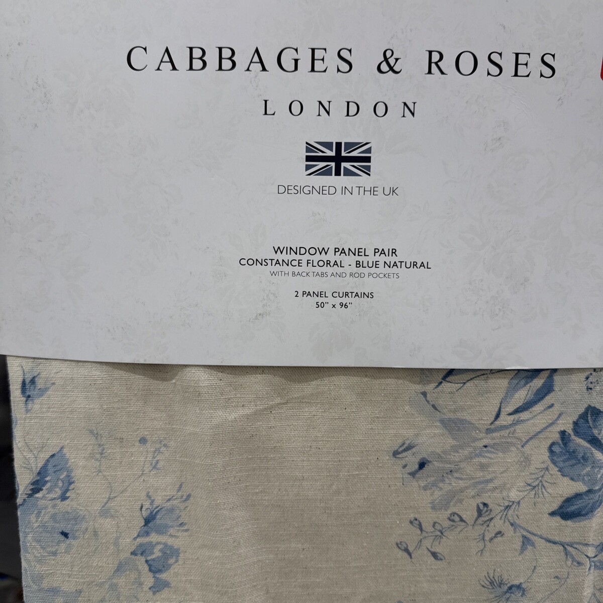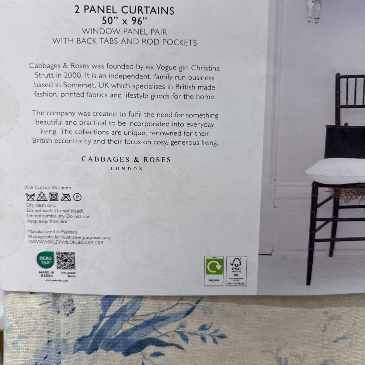 - Cabbage & Roses Constance Floral Blue Natural 2 Back Tab Window Panels 96” ~New~