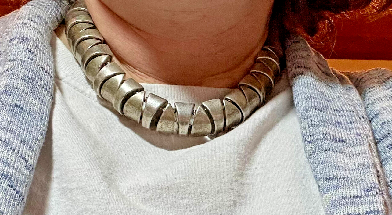 Excellent necklace. Designer made. Heavy and awesome collar length. Silver over pewter.