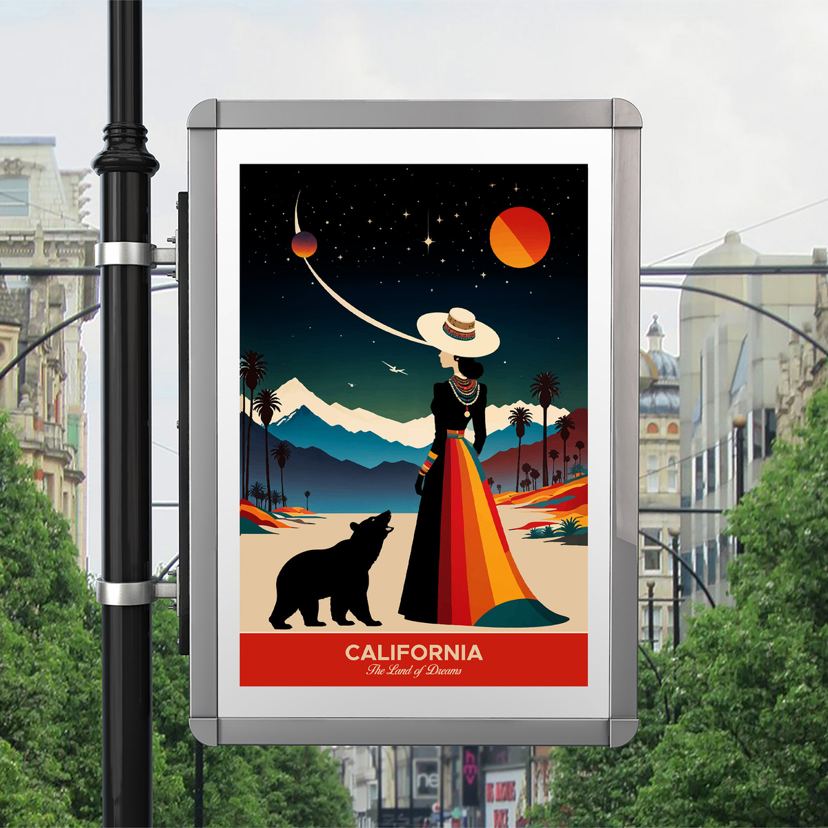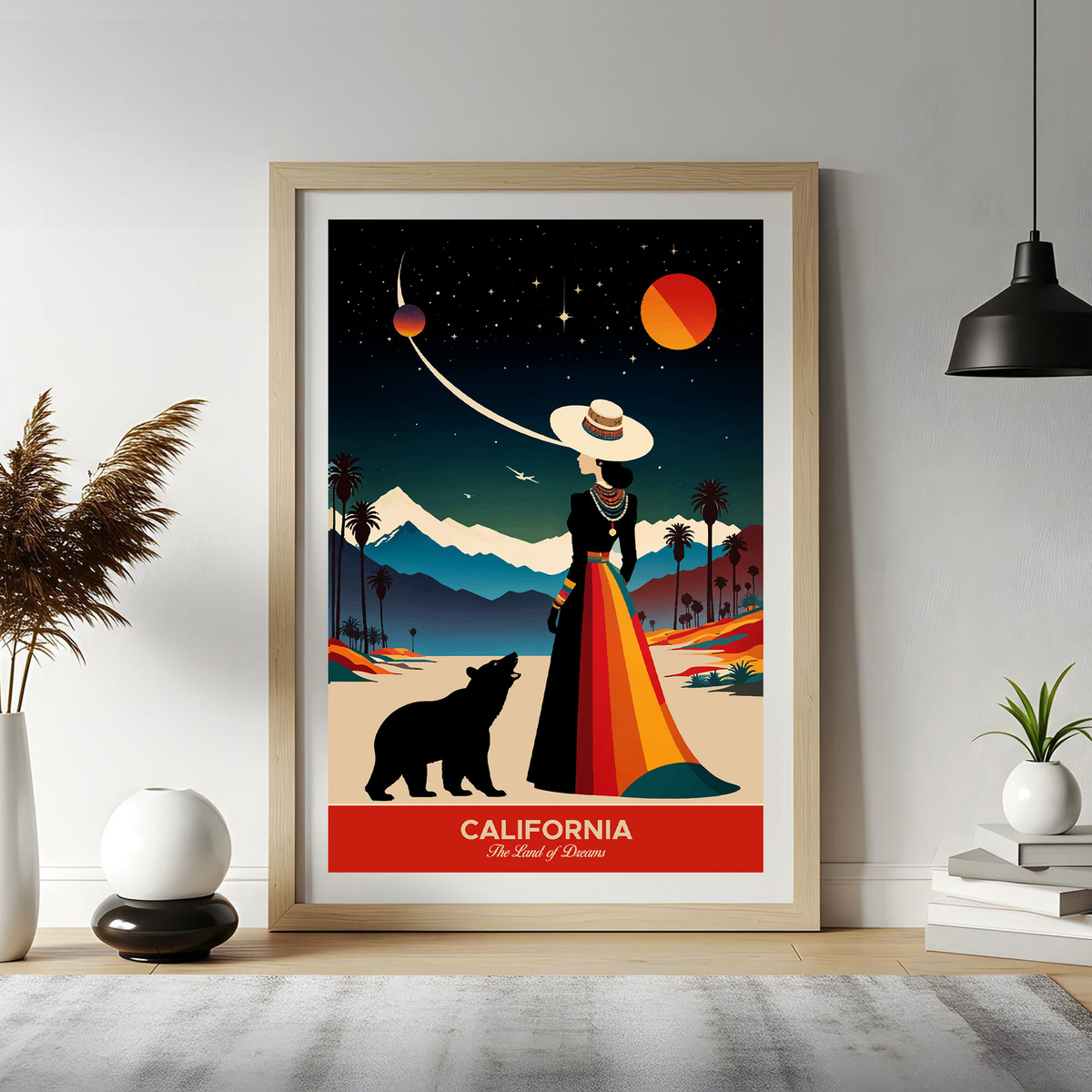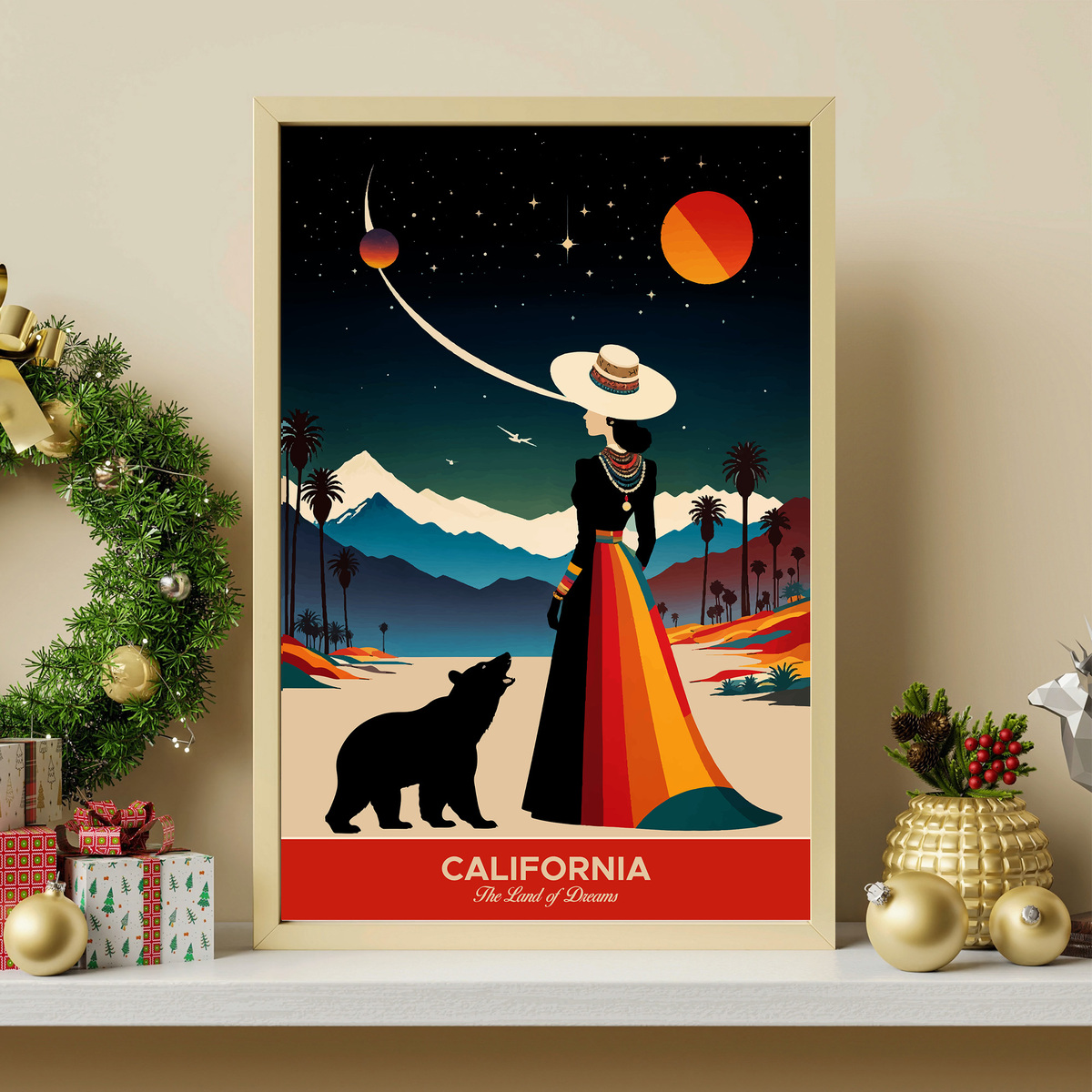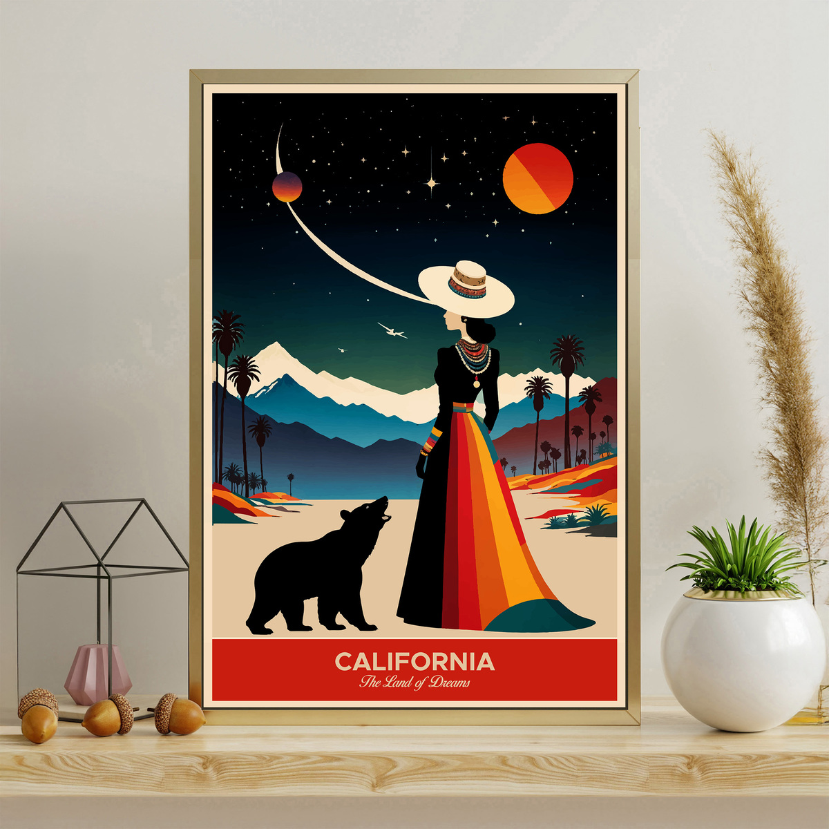 This California “Land of Dreams” poster blends retro travel aesthetics, art deco elegance, and bold vintage colors to create a timeless wall art piece. Perfect for lovers of classic travel prints, mid-century design, or California’s dreamy landscapes.