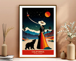 In this enchanting scene, a woman in a vibrant dress and wide-brimmed hat stands alongside a bear, both gazing up at a breathtaking night sky adorned with planets and stars. The backdrop features majestic snow-capped mountains and swaying palm trees, perfectly embodying California’s diverse beauty. Above this whimsical tableau, the phrase "California: The Land of Dreams" captures the magic and adventure that await in the Golden State.