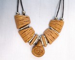 CHUNKY BOHEMIAN CAMEL / BEIGE / SAND COLOR STONE BEADS - 4 HAVE VERTICAL ETCHINGS PENDANT BEAD HAS AN INFINITY GALAXY SPIRAL SWIRL DESIGN with SILVER TONE ACCENT BEADS - IT IS A DOUBLE ROW COLLAR STYLE NECKLACE ON BLACK CORDS